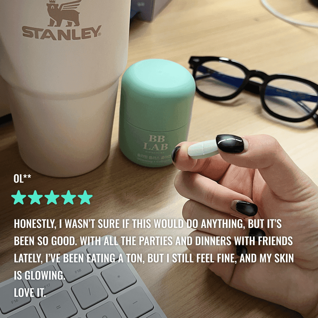 | Ingredients | Green tea extract (70% Catechins), Low Molecular Fish Collagen, Microcrystalline Cellulose, Hydroxypropylmethyl Cellulose, Silicon Dioxide, Magnesium Stearate, Titanium Dioxide, Glycerin Fatty Acid Ester, Corn Protein Powder, (Gardenia Green Colour, Gardenia Blue Colour, Dextrin, Safflower Yellow Colorant), Garcinia Cambogia Husk Extract, L-Carnitine, (Hibiscus Powdered Extract, Hibiscus Powdered Extract, Maltodextrin), (BB LAB Complex, Grape Extract Powder, L-Arginine, L-Glutamic Acid, Star Anise Extract Powder, Ginger Extract Powder, Haematococcus Extract Powder, Aloe Vera Extract Powder), (Gardenia Yellow Colour, Gardenia Yellow Colour, Maltodextrin) |