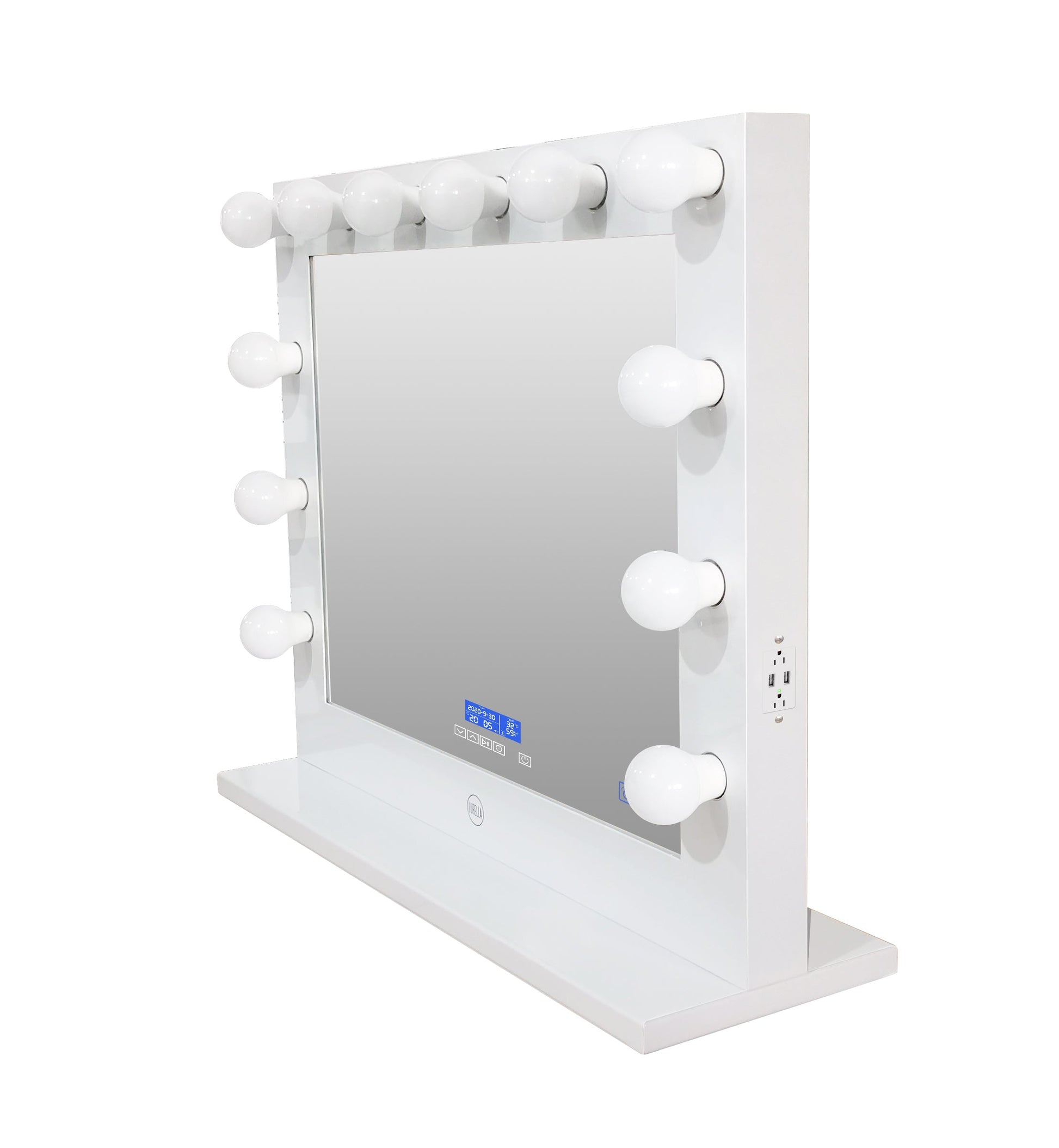 Glam out in style with our new LUXE 12 Bulb Glam Bluetooth Mirror! Get ready while listening to your favorite music with it's wireless Bluetooth speakers, featuring touch-sensitive buttons to control the volume and Bluetooth pairing. This vanity mirror has 12 removable bulbs, so you can get the perfect lighting experience, and comes with 2 extra bulbs!