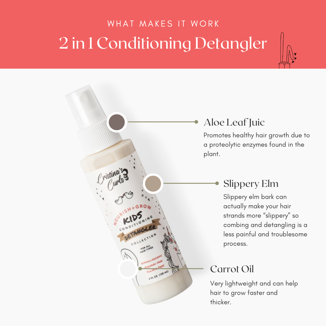 Say good bye to "tear filled" days! Our Nourish and Grow conditioning detangler is formulated with, Sweet Almond oil, Aloe leaf juice, Carrot oil and more, to bring dry/ damaged hair back to a healthy state. This formula is infused with ingredients that moisturize, condition, and detangle, while gently hydrating your child's natural hair from root to ends. Our conditioning detangler is the best product on the market, to leave your little one's hair manageable & easy-to-comb.