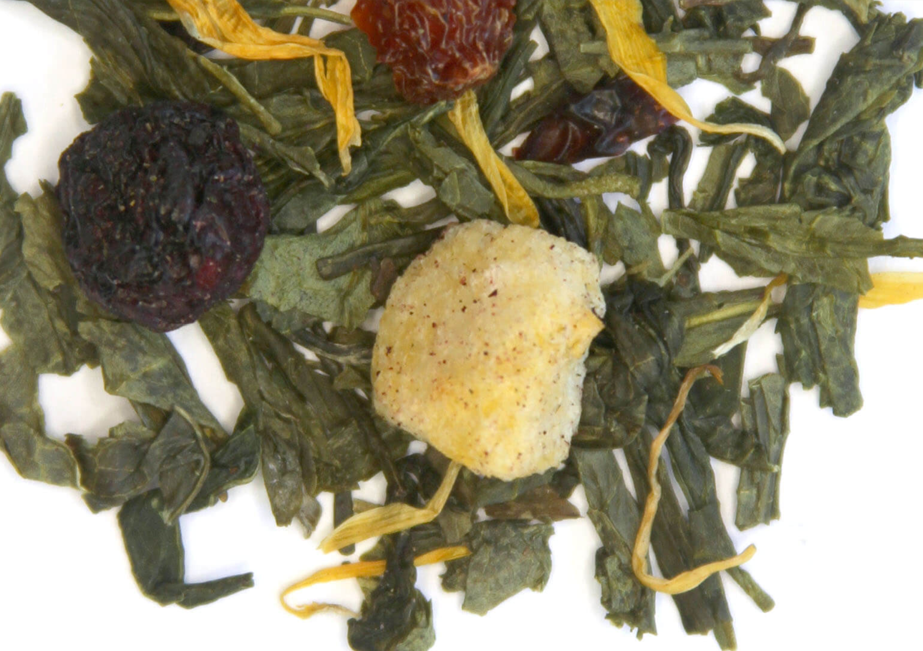 INGREDIENTS: Green Tea, Rose Hips, Blueberries, Peach Pieces, Natural Blueberry Flavor, Natural Peach Flavor, Marigold Flowers & Natural Vanilla Flavor