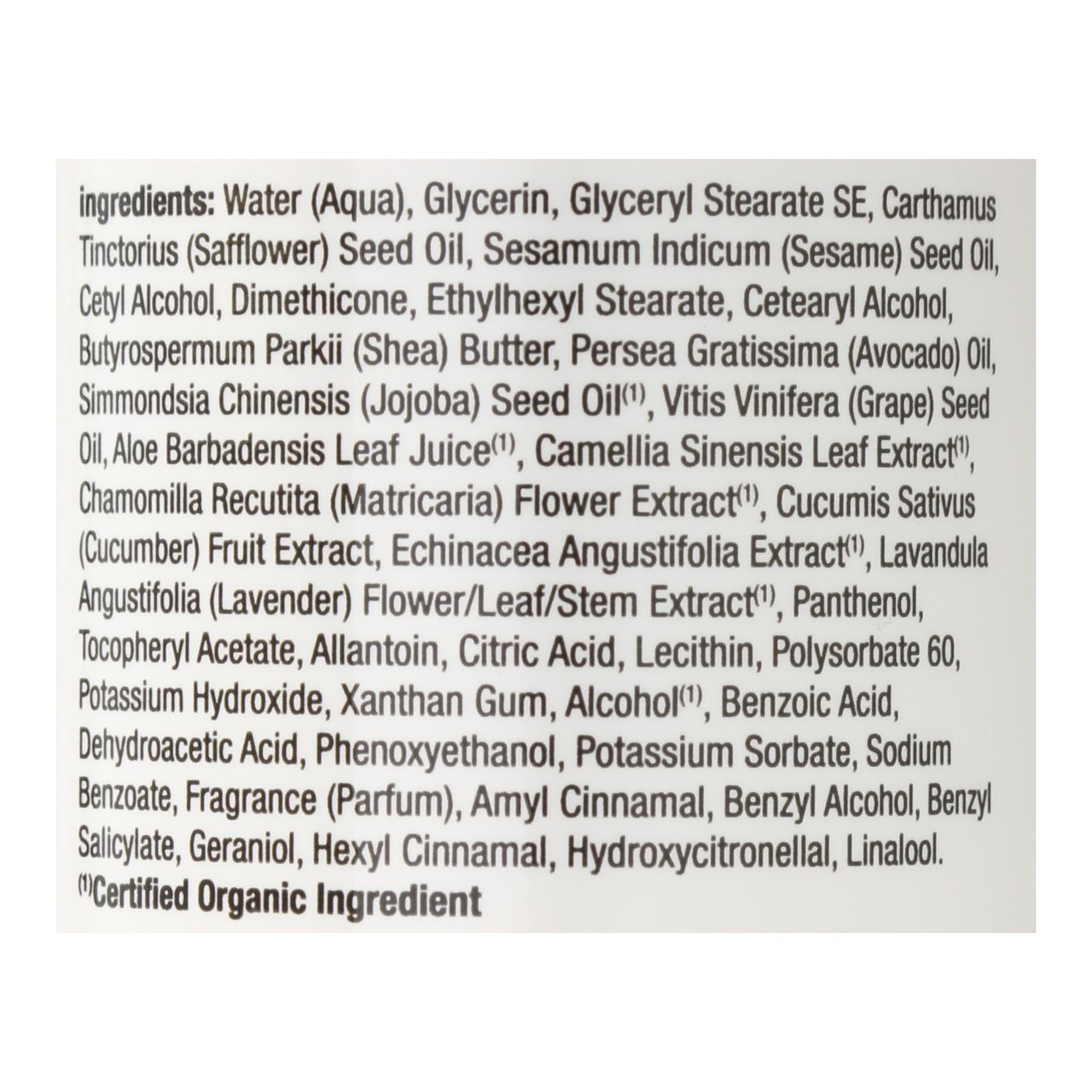 ingredients : water (aqua);glycerin;glyceryl stearate se;carthamus tinctorius (safflower) seed oil;sesamum indicum (sesame) seed oil;cetyl alcohol;dimethicone;ethylhexyl stearate;cetearyl alcohol;butyrospermum parkii (shea) butter;persea gratissima (avocado) oil;simmondsia chinensis (jojoba) seed oil⁽¹⁾;vitis vinifera (grape) seed oil;aloe barbadensis leaf juice⁽¹⁾;camellia sinensis leaf extract⁽¹⁾;chamomilla recutita (matricaria) flower extract⁽¹⁾;cucumis sativus (cucumber) fruit extract;echinacea angustifol