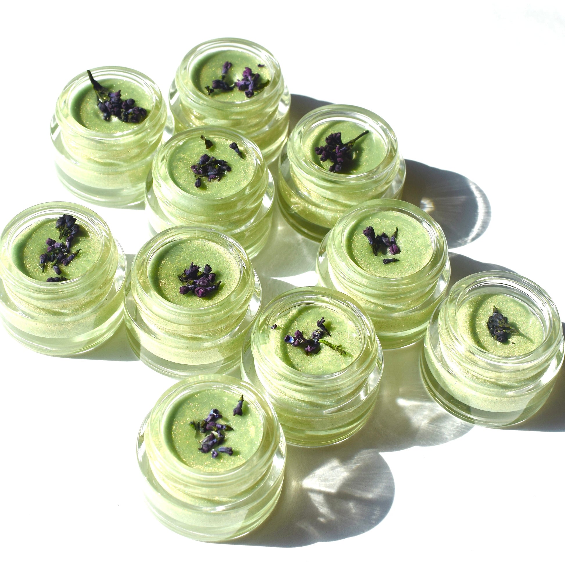 a light green (transparent-ish) gold shimmer makeup gloss balm for eye lids, lips + cheeks. very soft and squishy in texture.