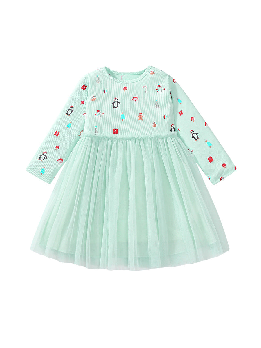 Arrival Autumn Girls Cartoon Christmas Print Crew Neck Long Sleeves Tulle Patchwork Princess Dress