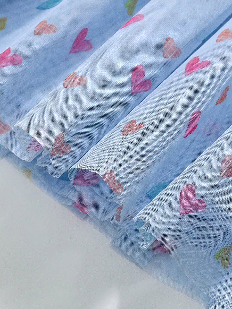 Bring a splash of fun to autumn with this playful girls' dress featuring heart prints, a cozy crew neck, and long sleeves perfect for cooler days. The striped design and tulle patchwork add a charming princess touch, making it ideal for twirling and everyday adventures. Soft and stylish, it’s the perfect pick for your little one’s seasonal wardrobe.