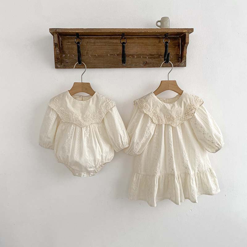 Arrival Spring Baby Kids Girls Ruffle Collar Long Sleeves Floral Embroidery Onesies And Dress – Princess Sister Matching Set