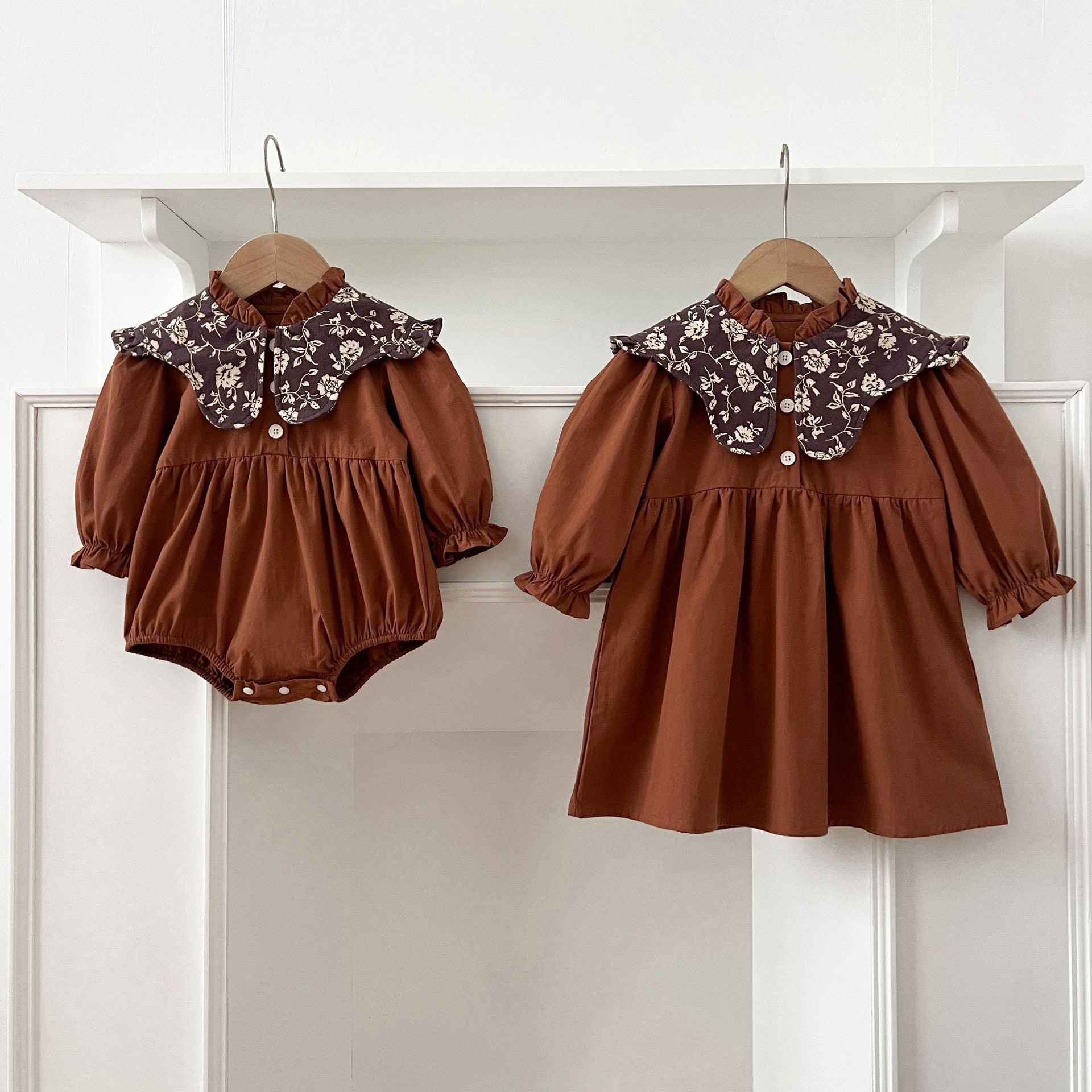 Arrival Spring Baby Kids Girls Vintage Floral Pattern Long Sleeves Onesies and Dress – Princess Sister Matching Set