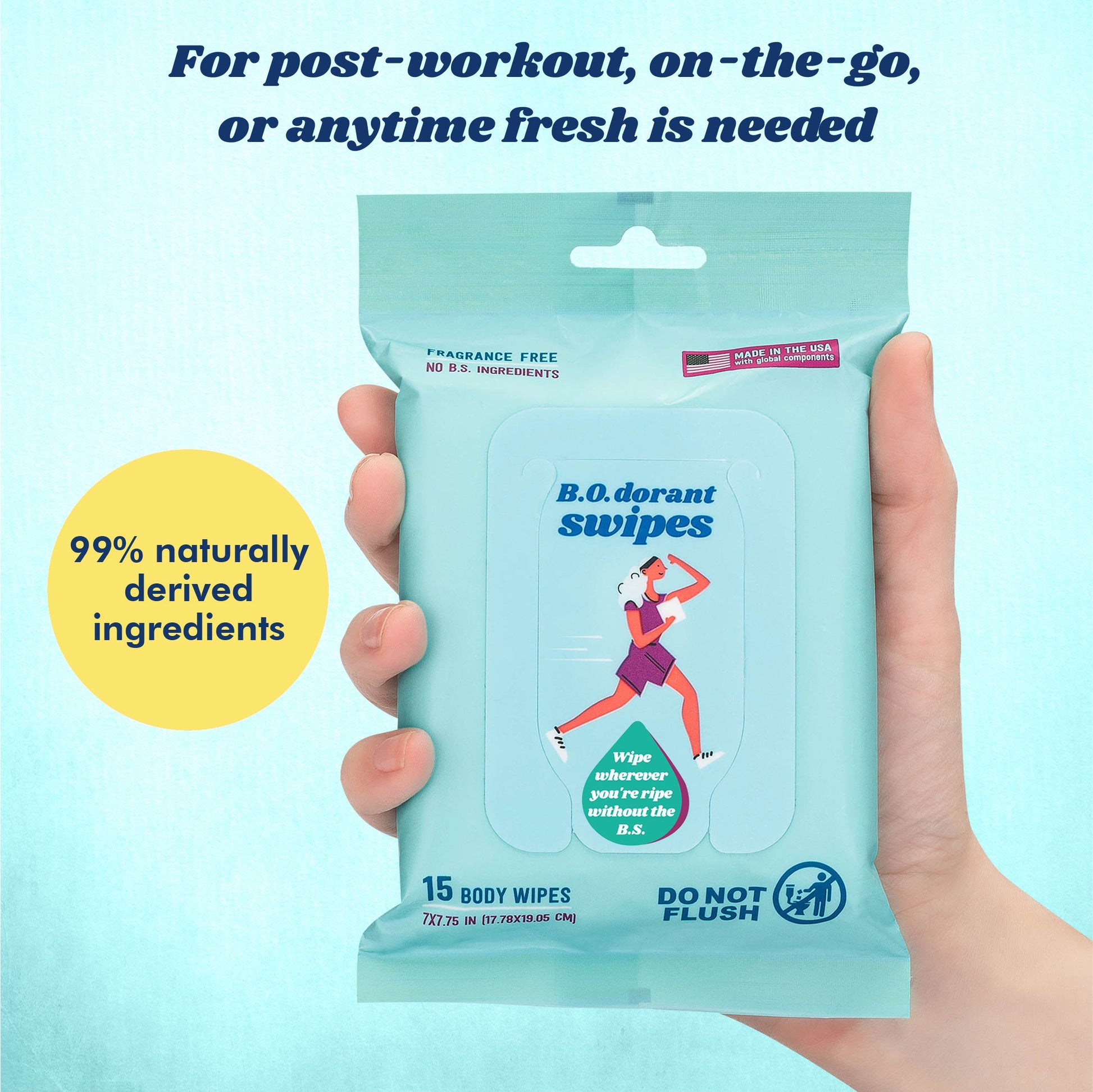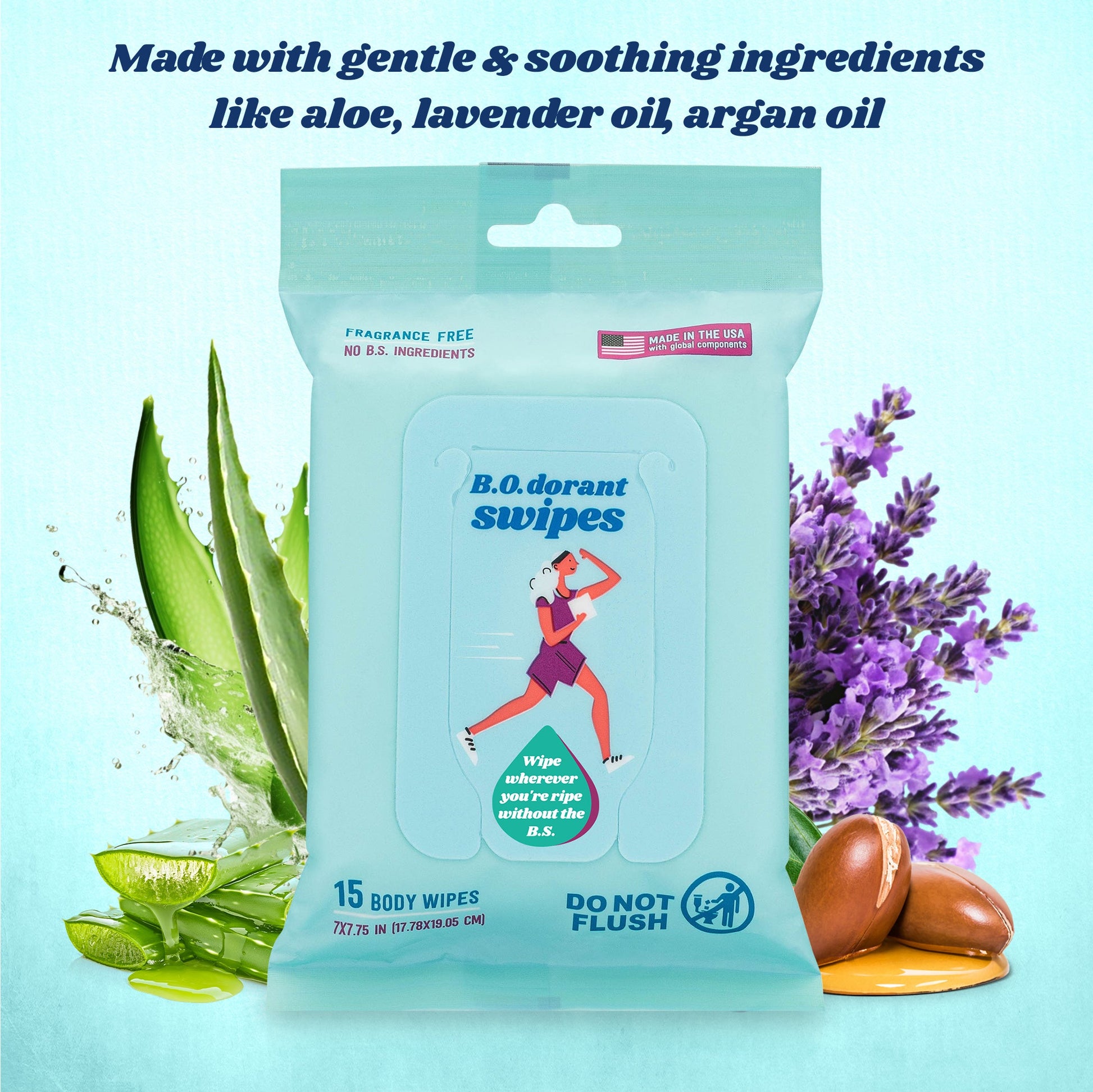 B.O.dorant Swipes are ultra-refreshing, portable body wipes made for post-run funk, camp grime, gym sweat, and anywhere else the stink sets in. Designed for athletes and outdoorsy people who need a quick, discreet clean-up when you're between showers. Packed with aloe, argan, and lavender oil, these extra large swipes are fragrance free, alcohol free, and pH balanced—safe to use on pits, face, privates, and anywhere in between. Throw a few in your pack, pocket, or glove box and swipe away the B.O. wherever you go - without the B.S.