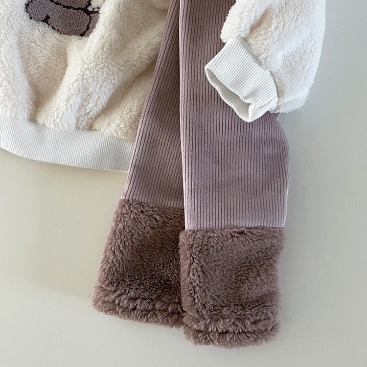 Baby Bear Embroidered Pattern Plush Hoodies Combo Pants Pieces Sets