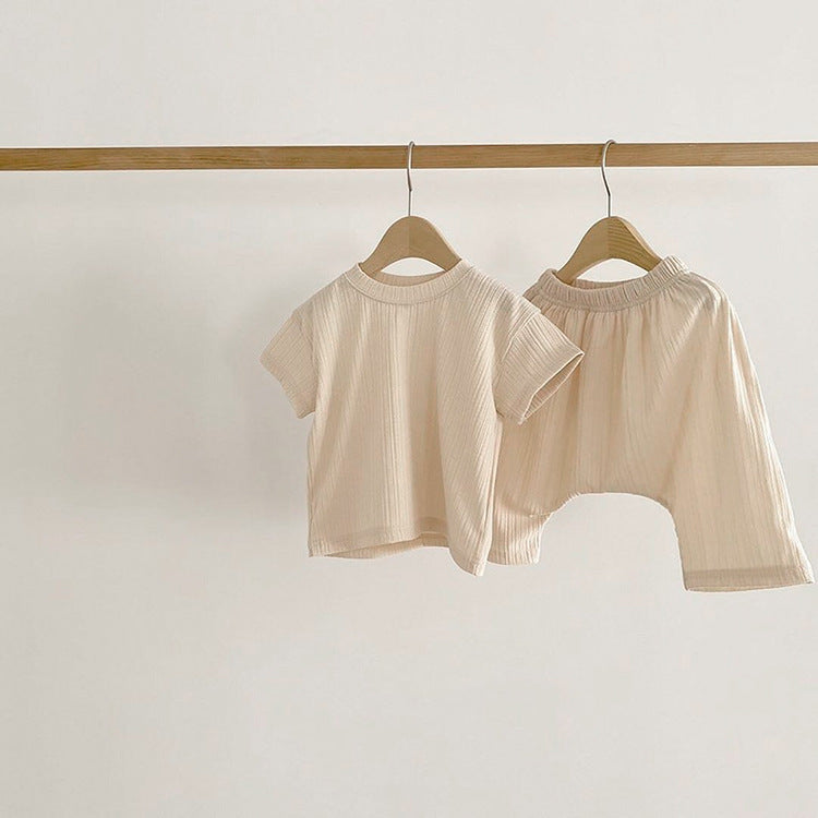 Baby Boys And Girls Solid Color Round Neck Short-Sleeved Top Combo Pants Sets Home Wear Pajamas In Summer