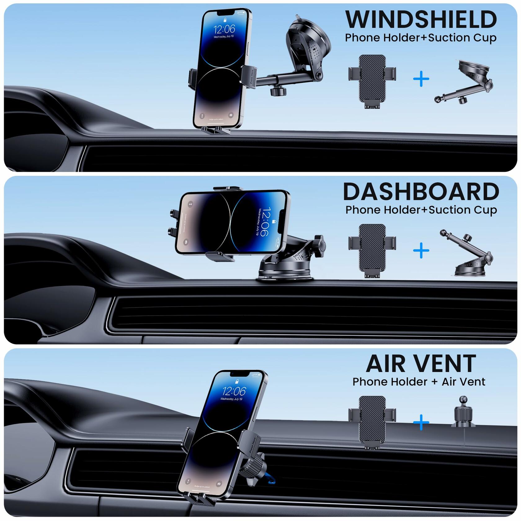 - Thick Cases Friendly: Windshield phone mount for car features wider arms and adjustable feet to accommodate large-sized phones 4.0-7.1inch and cases up to 14mm thick. The reinforced vacuum airbag silicone arms provide a stable grip and protection, ensuring that your iPhone remains scratch-free.
