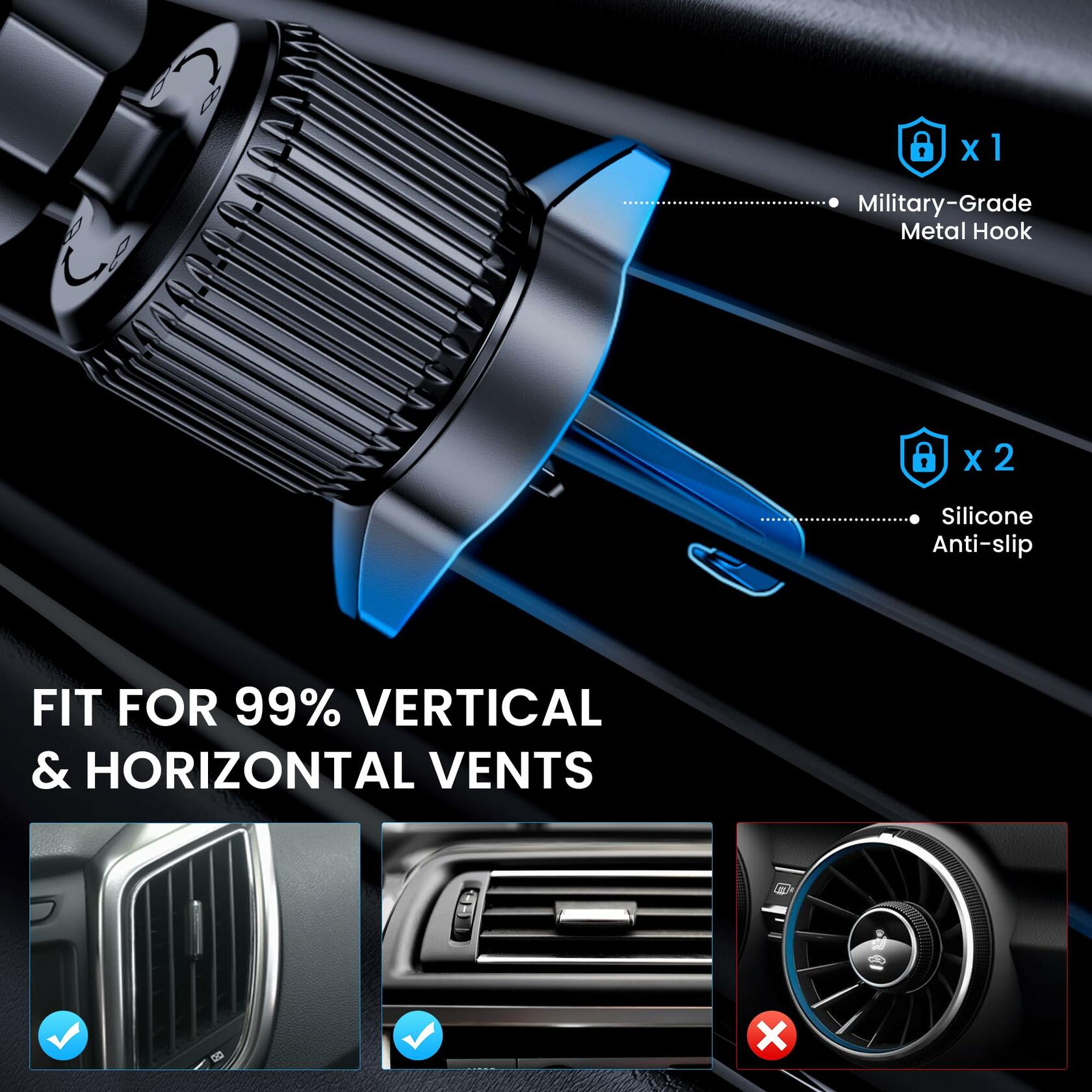 - Upgraded Metal Hook: Phone stand for car features an upgraded metal hook with a thick plastic layer wrapped around outside which firmly locking the vent blades without scratches. The vent cilp fit for all 0-3.5mm width air vent blades. A good assistant for taxi and Uber drivers.