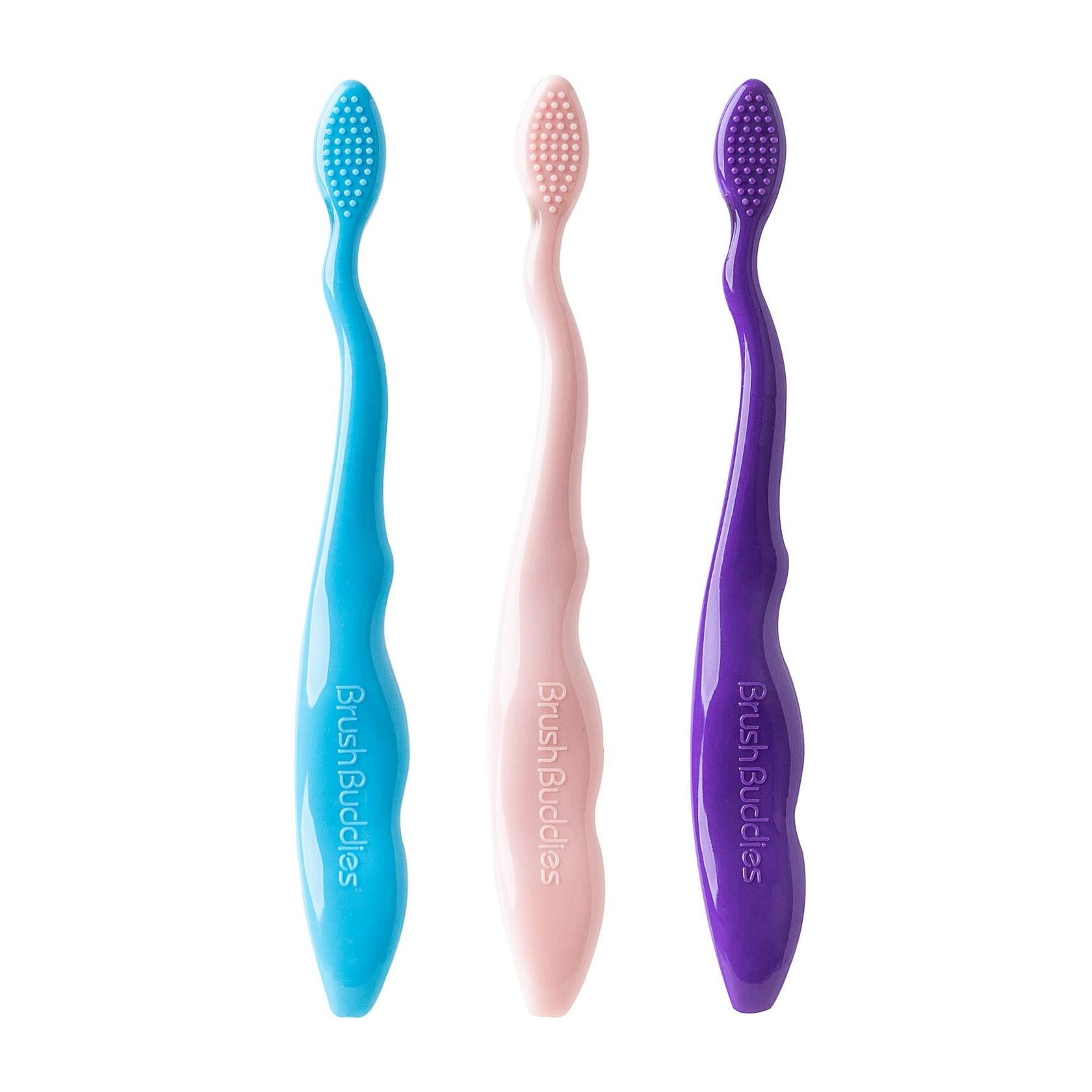It’s never too early to introduce a healthy oral care routine— start with Brush Buddies Barbie Toothbrushes! Each pack includes 3 soft bristle toothbrushes with a variety of colors and designs for a fun addition to your little one’s mornings and evenings. Each children’s toothbrush features a small, rounded brush head and textured ergonomic handle for easy grip. The bristles are gentle enough to effectively clean while protecting your child’s sensitive gums and enamel.