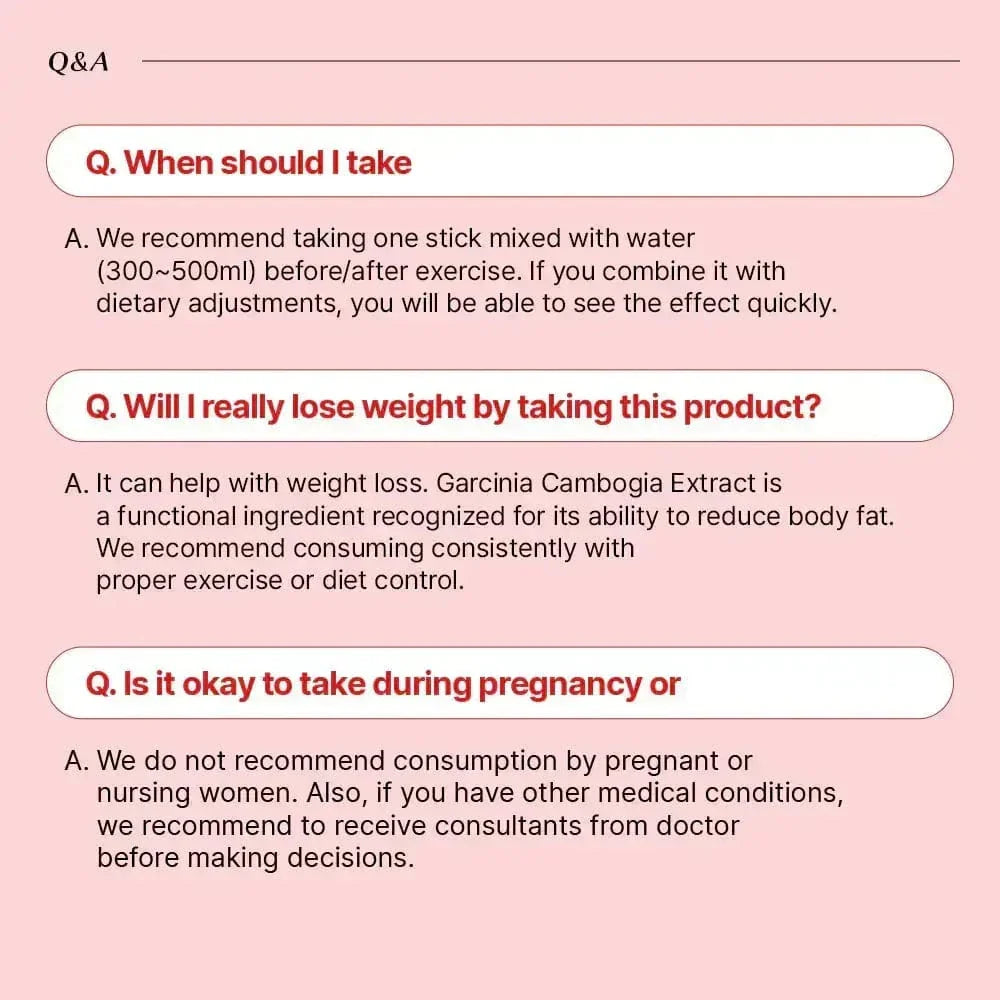 | Ingredients | Erythritol, Xylitol, Garcinia Cambogia Extract(Hydroxycitric Acid), Concentrated Orange Powder, Citric Acid, Mixed Fruit Powder, Orange Flavor Powder, Beta-Cyclodextrin, Enzymatically Modified Stevia, Beet Red, Zinc Oxide, Indigestible Maltodextrin, Fructooligosaccharide, Orange Extract Powder, Green Tea Extract Powder, Hibiscus Extract Powder, Thiamine mononitrate, Riboflavin, Mixed Probiotics Powder |