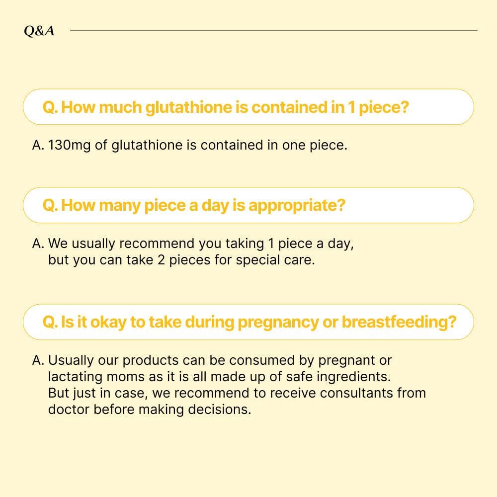 | Ingredients | L-Glutathione Yeast Extract (Glutathione 50%), Pullulan, Lemon Juice Powder[Dextrin, Lemon Juice (Lemon 100 %: American), Arabic Gum, Citric Acid, Mixture (Alcohol, Purified Water, Natural Flavoring, Natural Flavoring 2)], Vitamin C, Anhydrous Citric Acid, Hyaluronic Acid, Pectin, Enzymatically Modified Stevia, Natural Flavoring (Lemon Lime), B-cyclodextrin, Glycerin, Other Processed Edible Oils, Gardenia Yellow Color, L Dextrin, L Gardenia Yellow Color, Prolastin, Milk Thistle Extract Powder, Fish Collagen, Milk Ceramide, Vitamin E 50% Mixture(Dl-a-tocopheryl Acetate, Modified Starch, Glucose Syrup Powder, Silicon Dioxide), L-cysteine Hydrochloride, Modified Starch, Biotin |