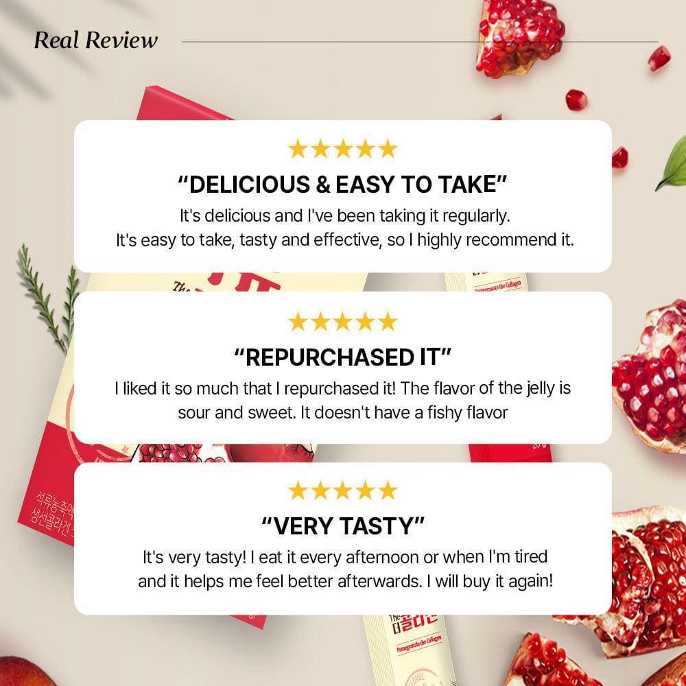 | Ingredients | Pomegranate concentrate, Fish collagen, Locust Bean Gum Mixed Powder(Locust Bean Gum, Xanthan Gum, Glucose, Agar, Tamarind Gum), Hibiscus Concentrate, Cranberry Concentrate, Elastin Extract Mixed Powder(Elastin, Collagen) , Hyaluronic Acid Mixed Preparation(Dextrin, Hyaluronic Acid), Mixed Berry Concentrate(Blackberry Concentrate, Blackcurrant Concentrate, Blueberry Concentrate, Strawberry Concentrate, Raspberry Concentrate, Cranberry Concentrate, Acai Berry Concentrate), Corn starch |