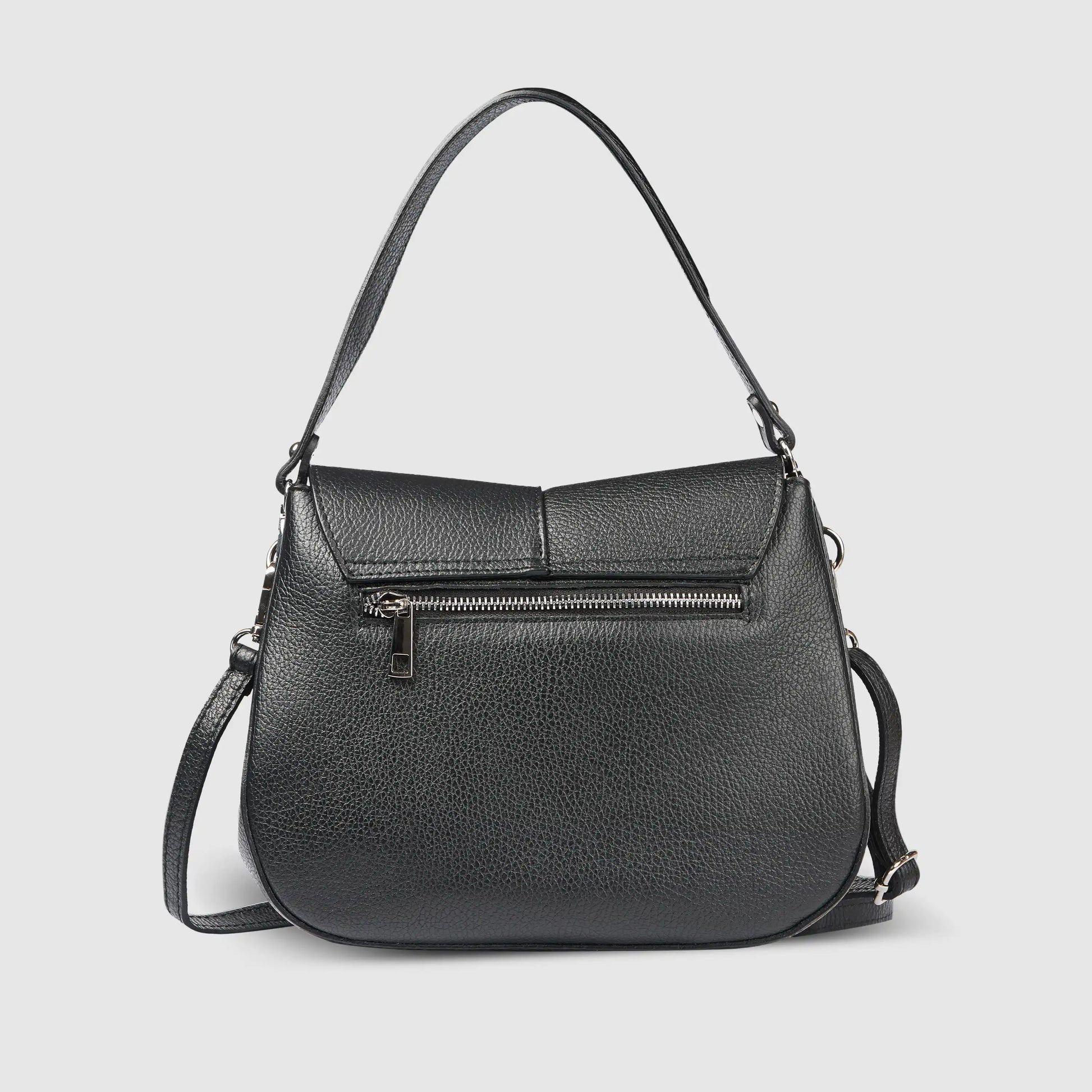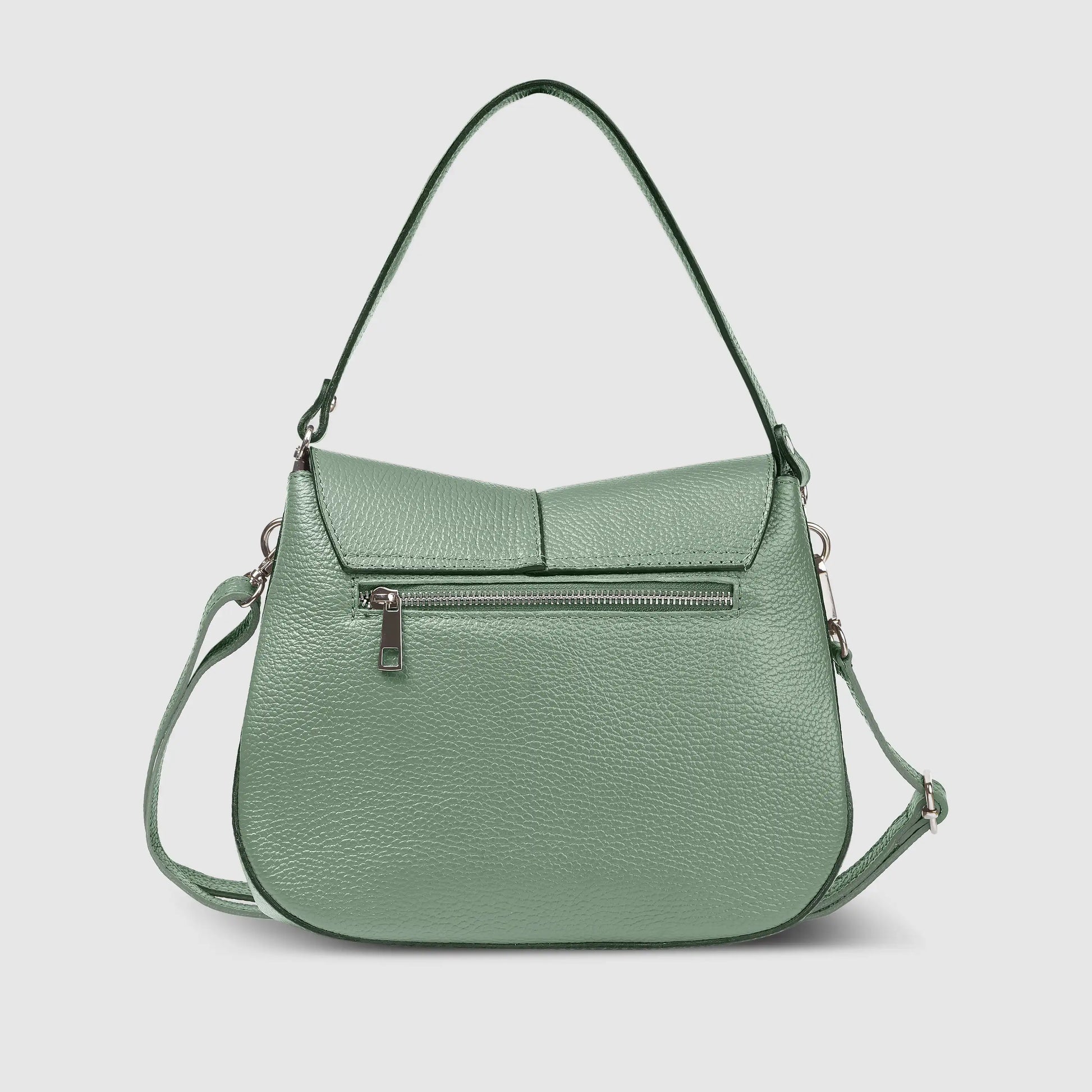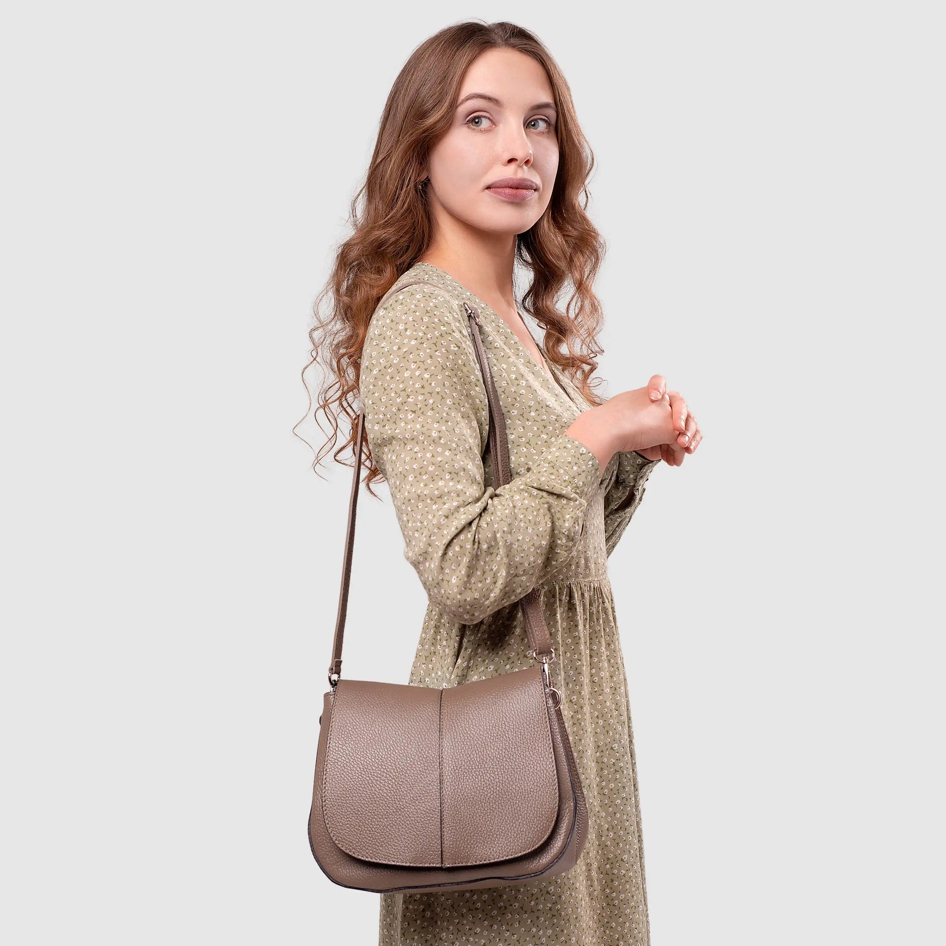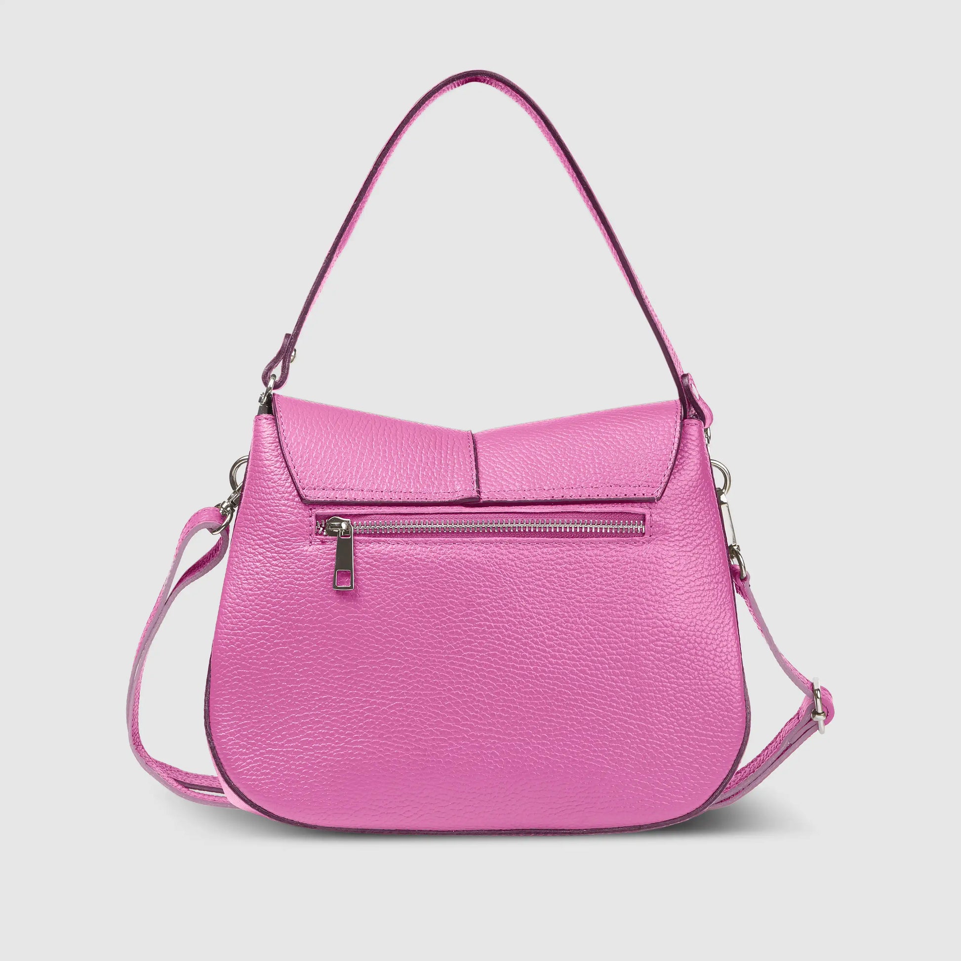 This medium-sized handbag features a softly structured, rounded-rectangle silhouette crafted from full-grain calf leather with a distinct pebbled texture. The front flap is detailed with a central vertical seam for a clean and symmetrical aesthetic. The bag maintains its shape while retaining a soft, elegant profile, thanks to its semi-rigid construction.
