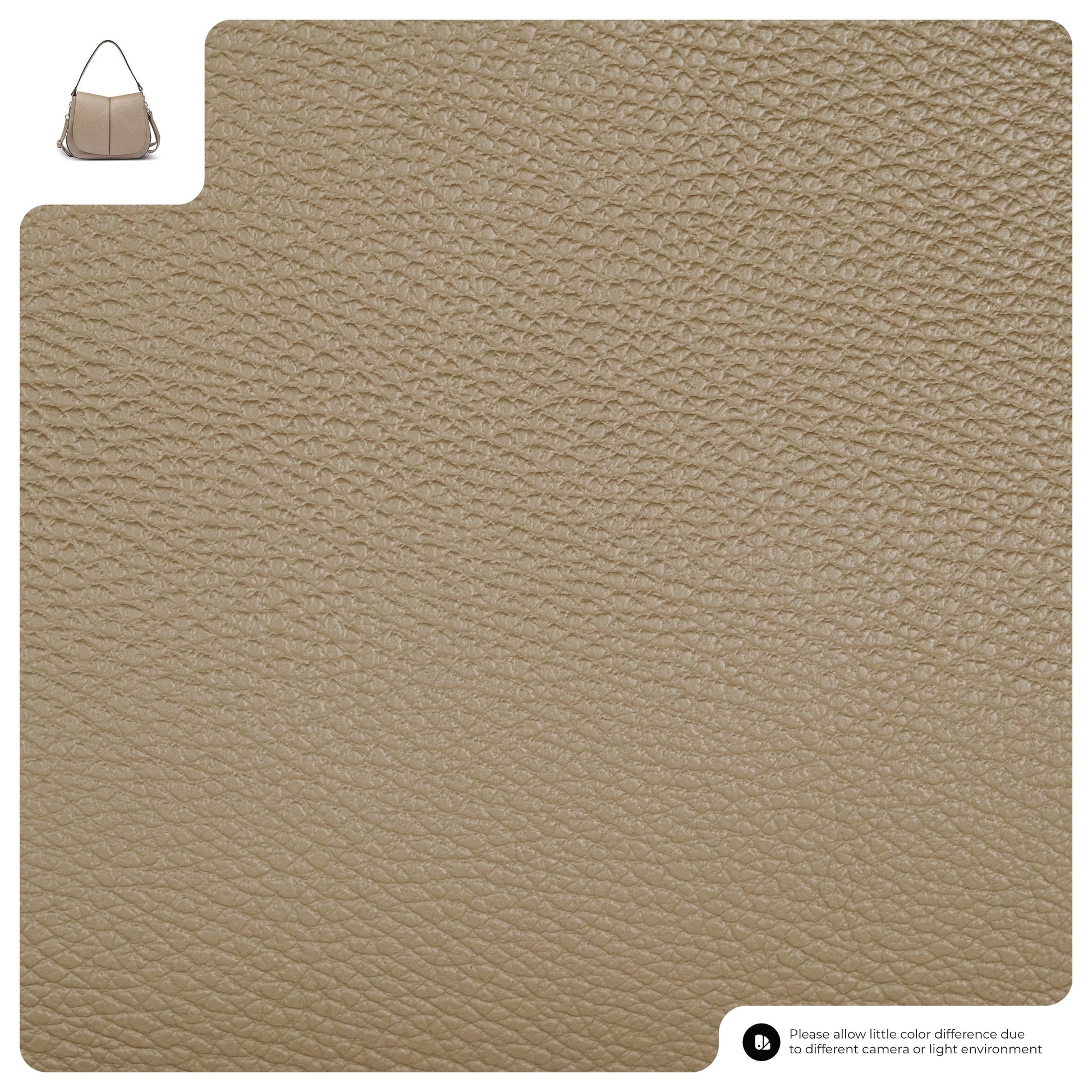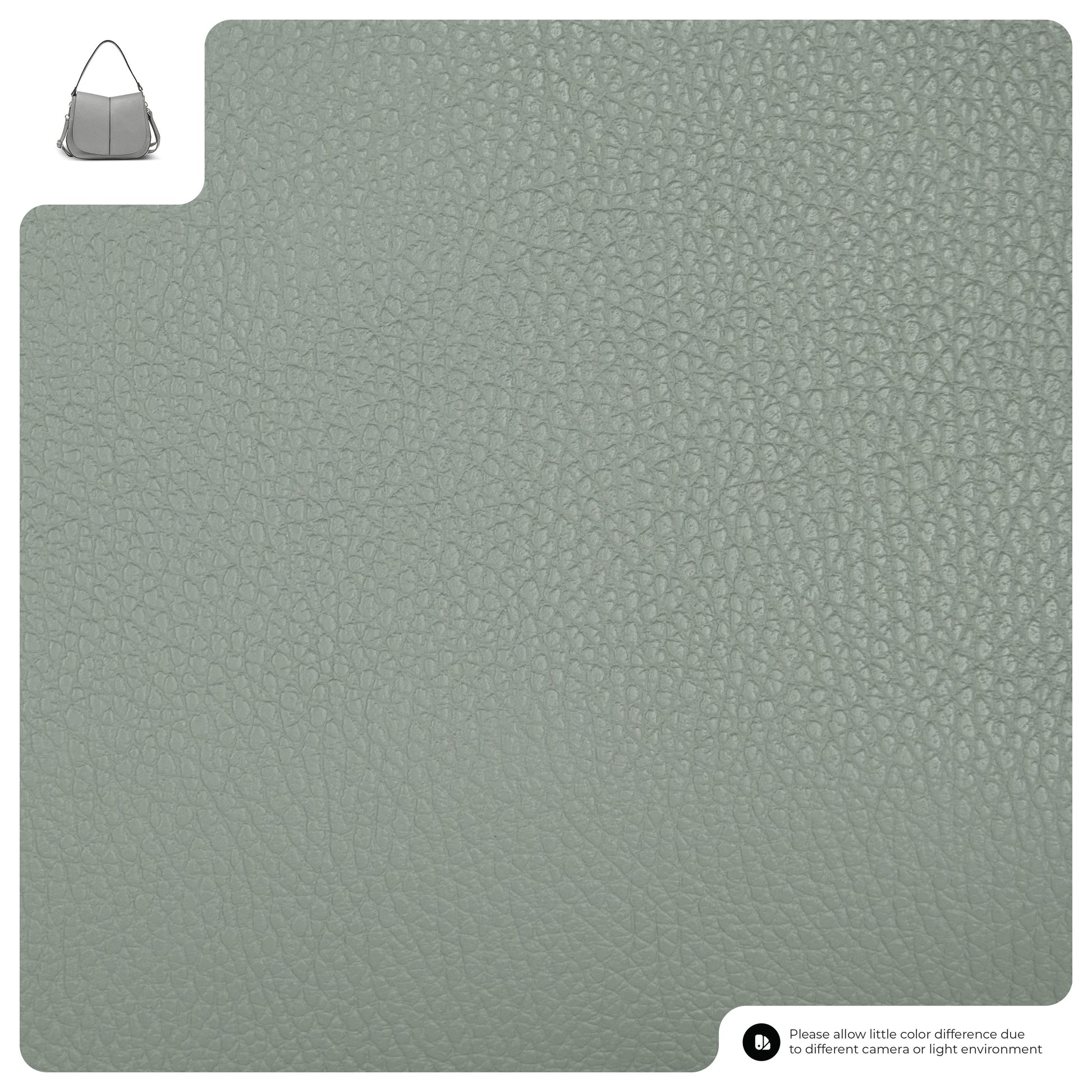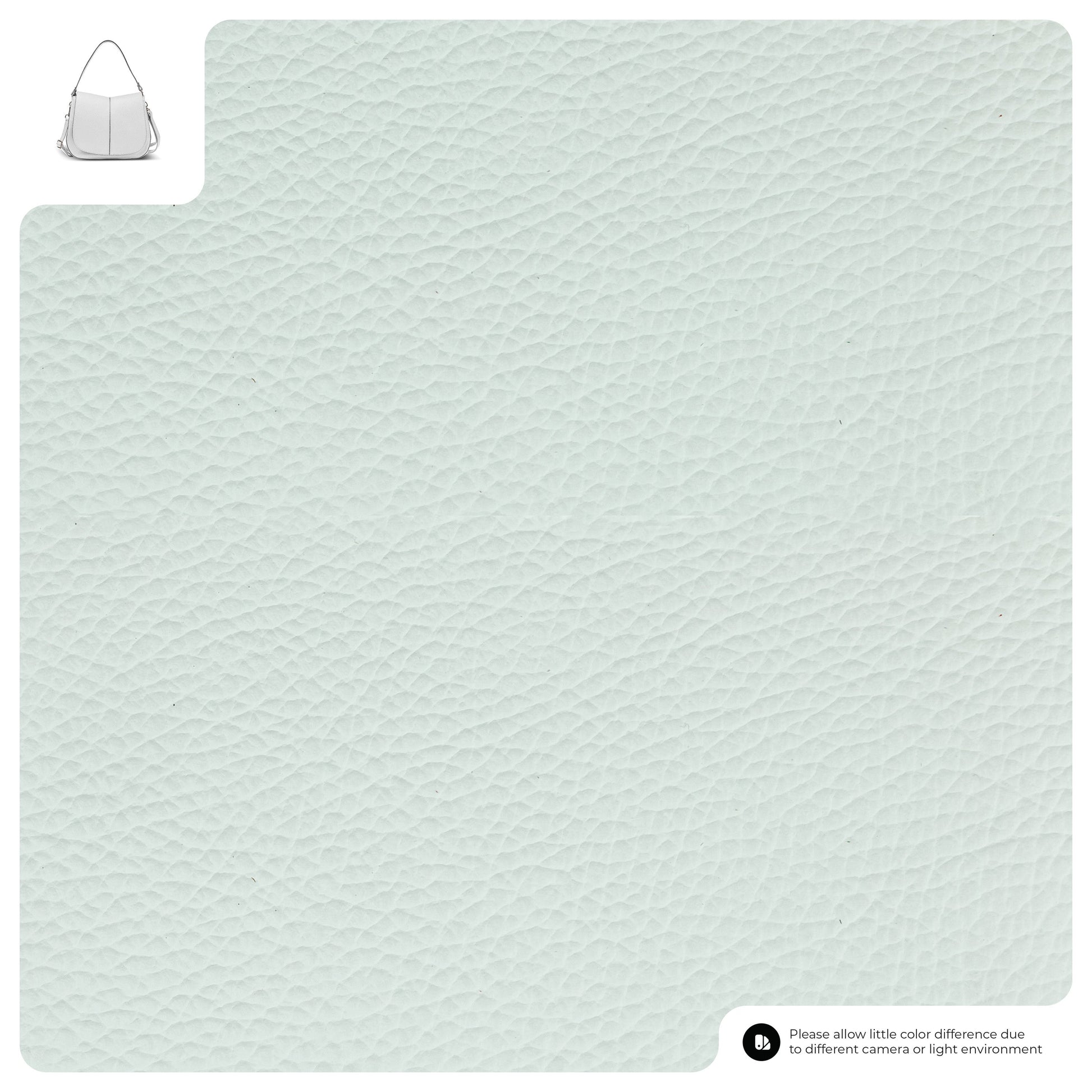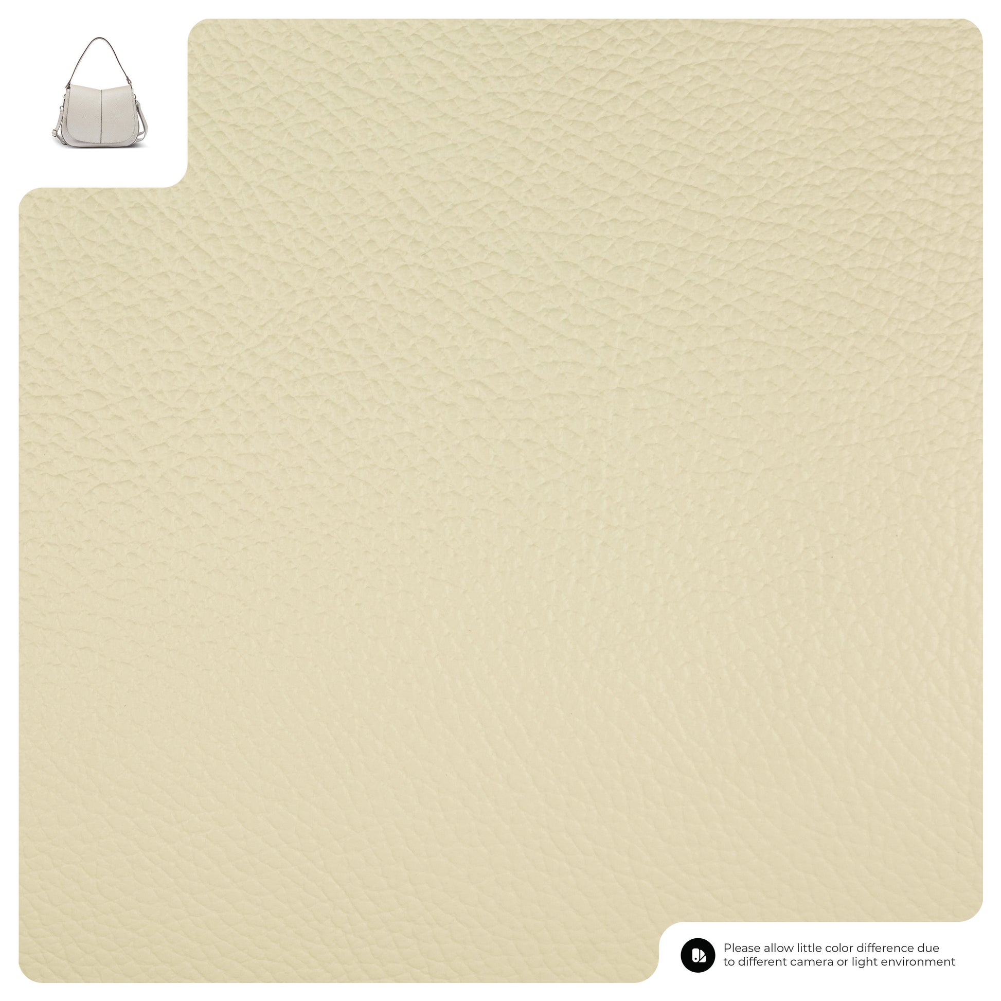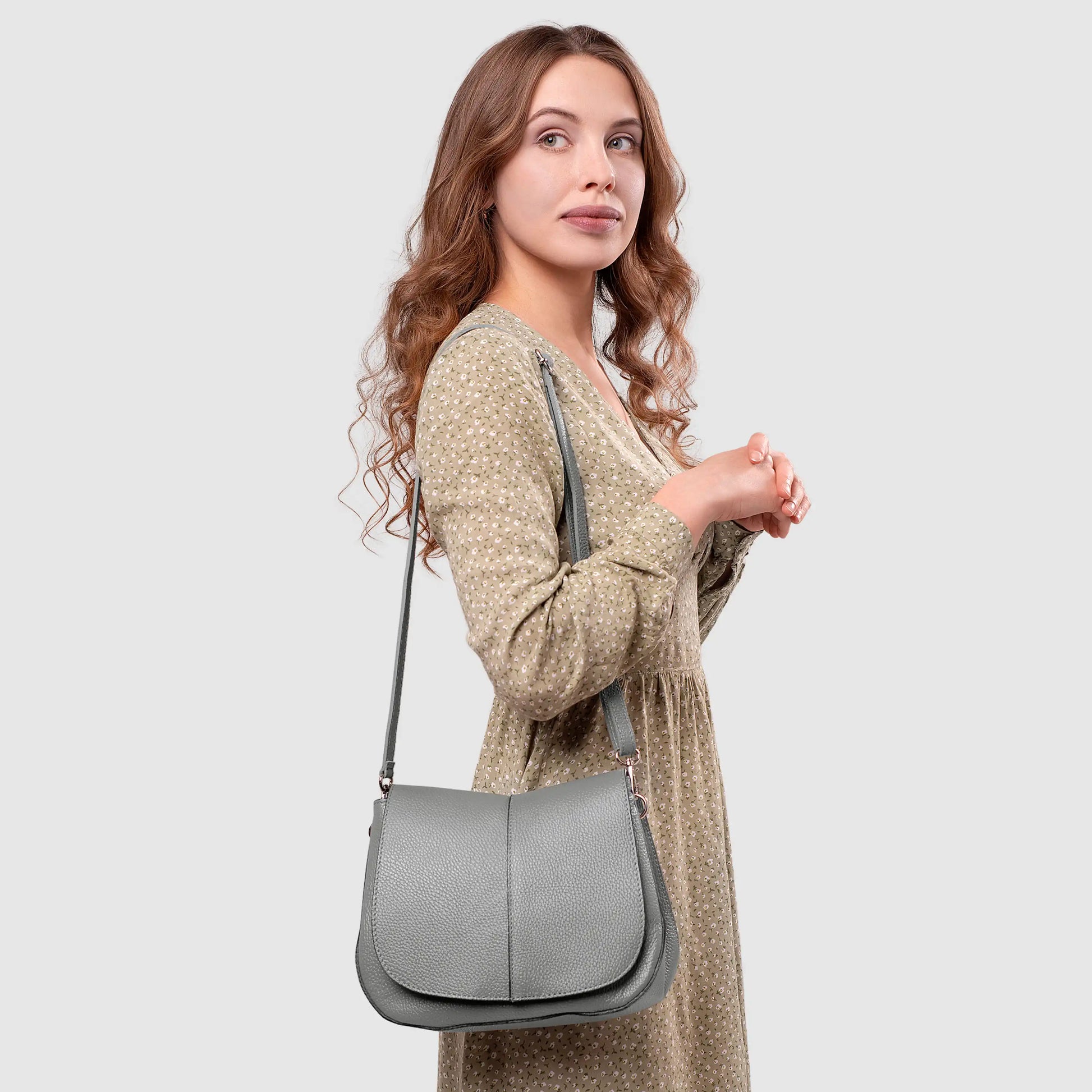 This medium-sized handbag features a softly structured, rounded-rectangle silhouette crafted from full-grain calf leather with a distinct pebbled texture. The front flap is detailed with a central vertical seam for a clean and symmetrical aesthetic. The bag maintains its shape while retaining a soft, elegant profile, thanks to its semi-rigid construction.