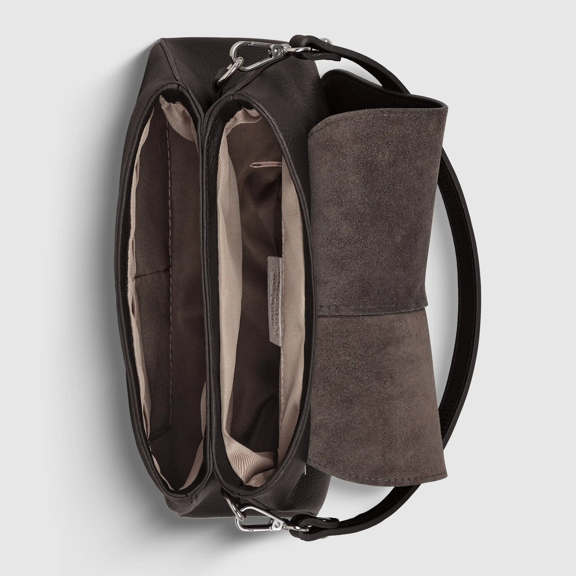 The interior is divided into two fully separate main compartments, each accessible under a flap secured by a hidden magnetic snap. One compartment includes a zippered pocket, while the other contains two open slip pockets—ideal for organizing smaller essentials like cards or a phone. The underside of the flap is lined with genuine suede, adding a refined tactile contrast.