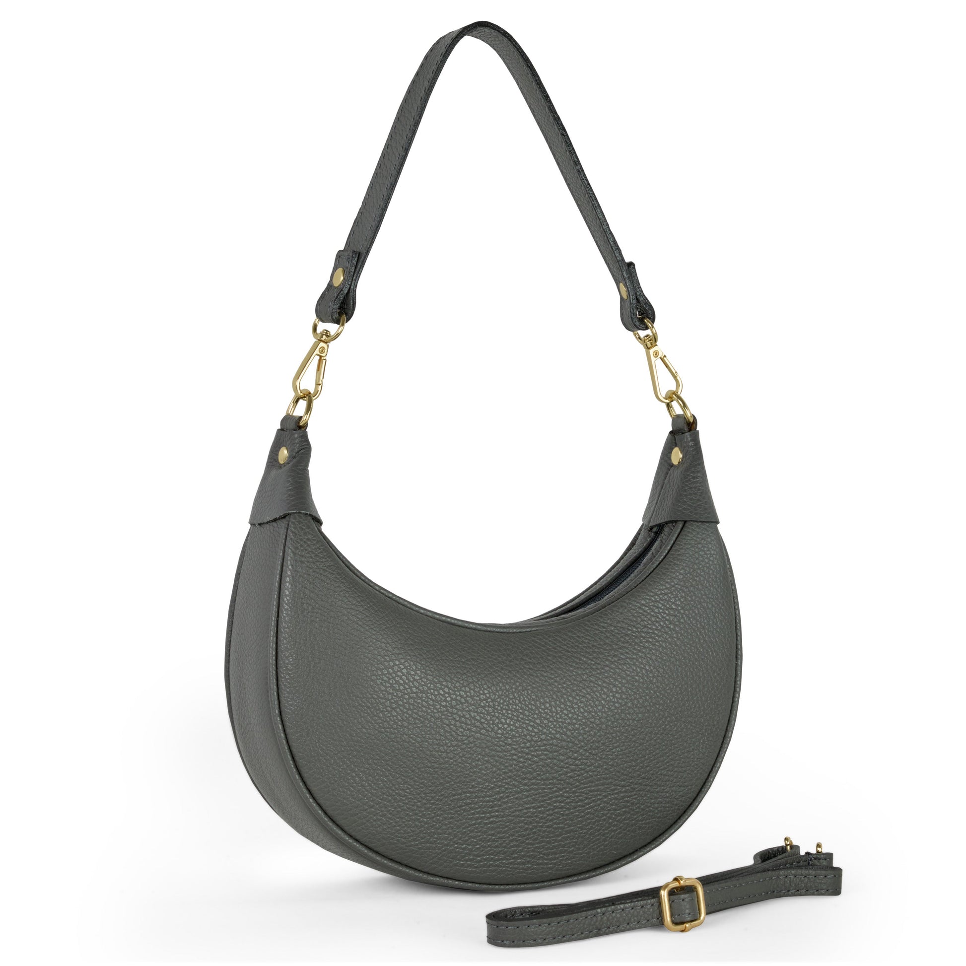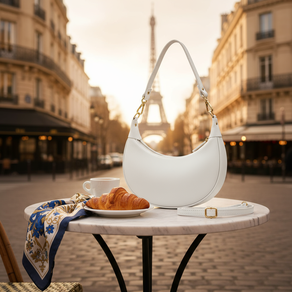 The bag is a refined blend of minimalism and elegance, born in the heart of Italy. Its crescent-shaped structure with sculptural leather details highlights its status as a true piece of artisan craftsmanship.