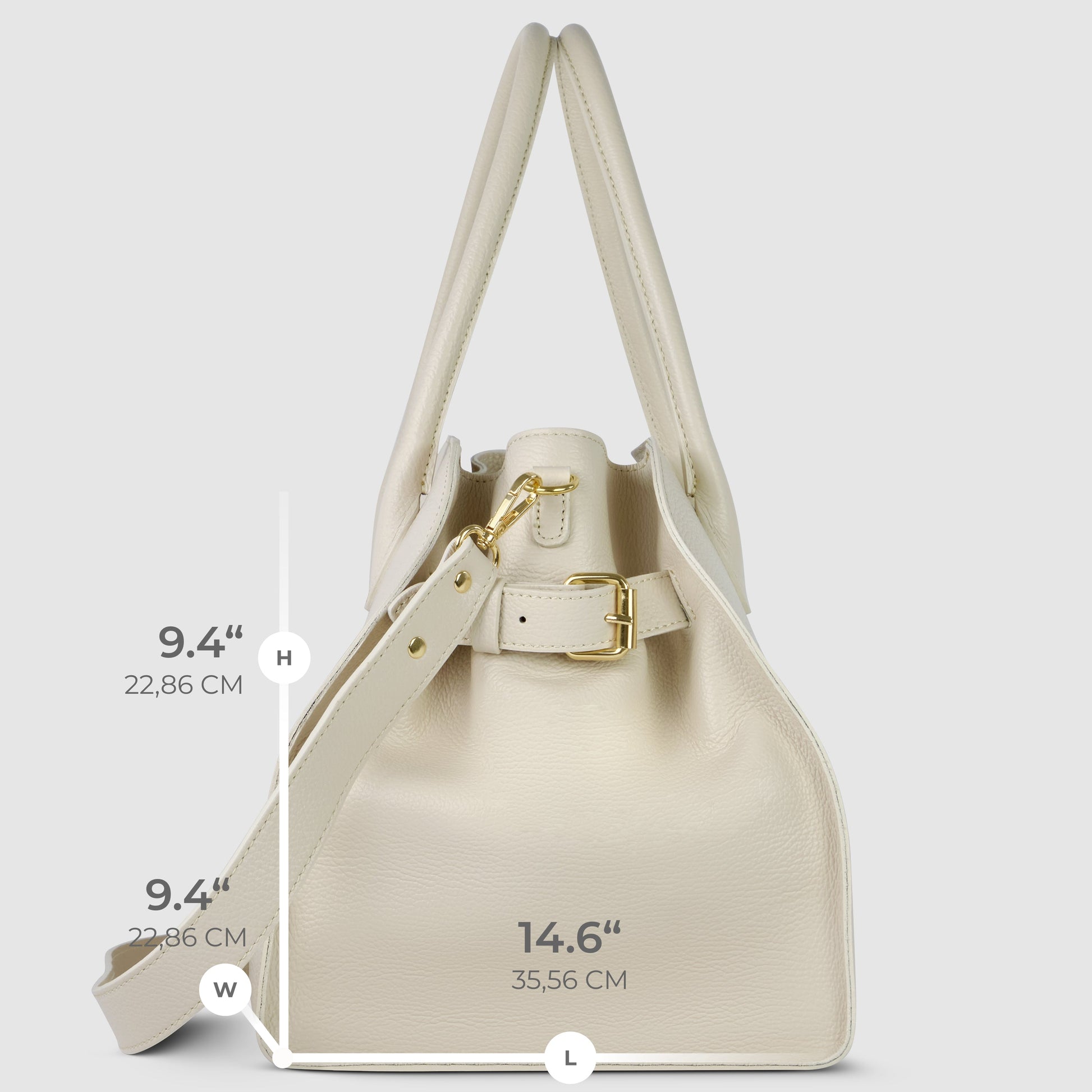 Elongated top handles allow for hand or elbow carrying, while a removable adjustable strap offers shoulder or crossbody wear. Polished gold-tone hardware and decorative side buckles complete the look with quiet sophistication.