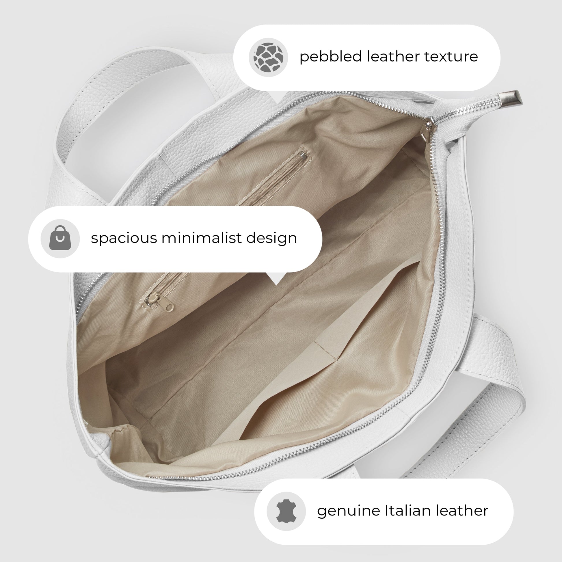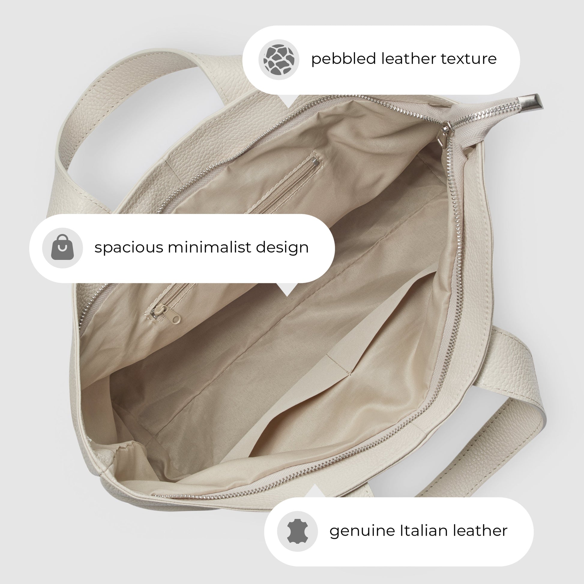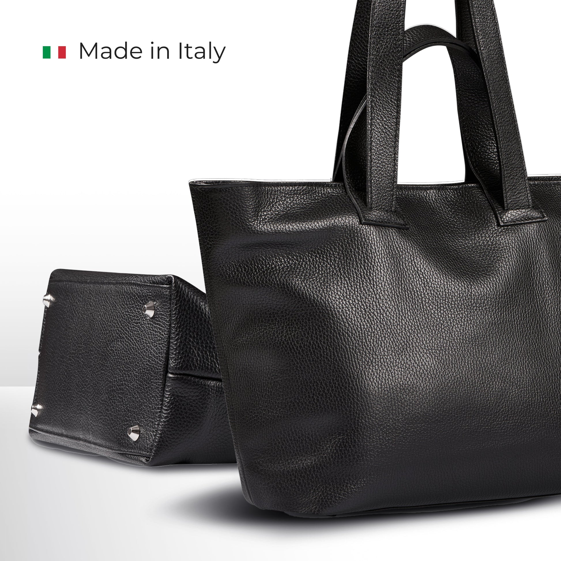 Two elegant top handles provide a comfortable hand-held option, while the long shoulder straps offer effortless shoulder carry. A smooth nickel-finish zipper keeps your belongings securely inside, and metal feet on the base protect the leather from wear.