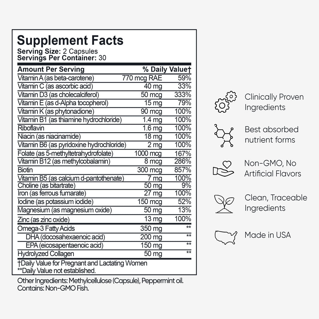 - Contains critical nutrients often missing from prenatal vitamins like Folate, DHA, Choline and Collagen