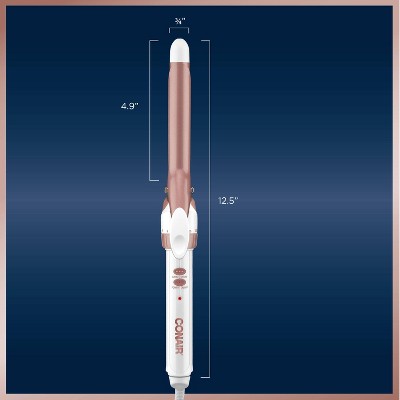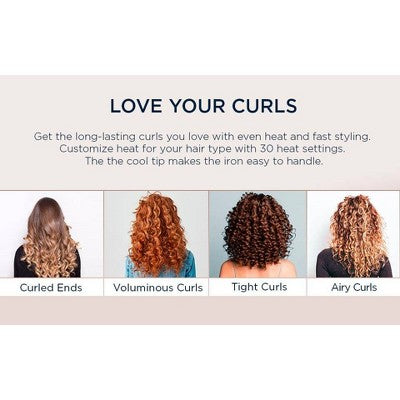 Introducing the NEW Conair Double Ceramic Curling Iron, 3/4", Rose Gold, designed to create beautiful classic curls. The higher ceramic content creates an even heat and gorgeous, long-lasting styles with less frizz. With 30 heat settings that instantly heat up to 400 Degrees F including Turbo Heat boost for difficult to style spots. The unique cool tip offers safe, easy handling and auto off feature. Includes dual voltage for international travel and a bonus carry pouch for packing.