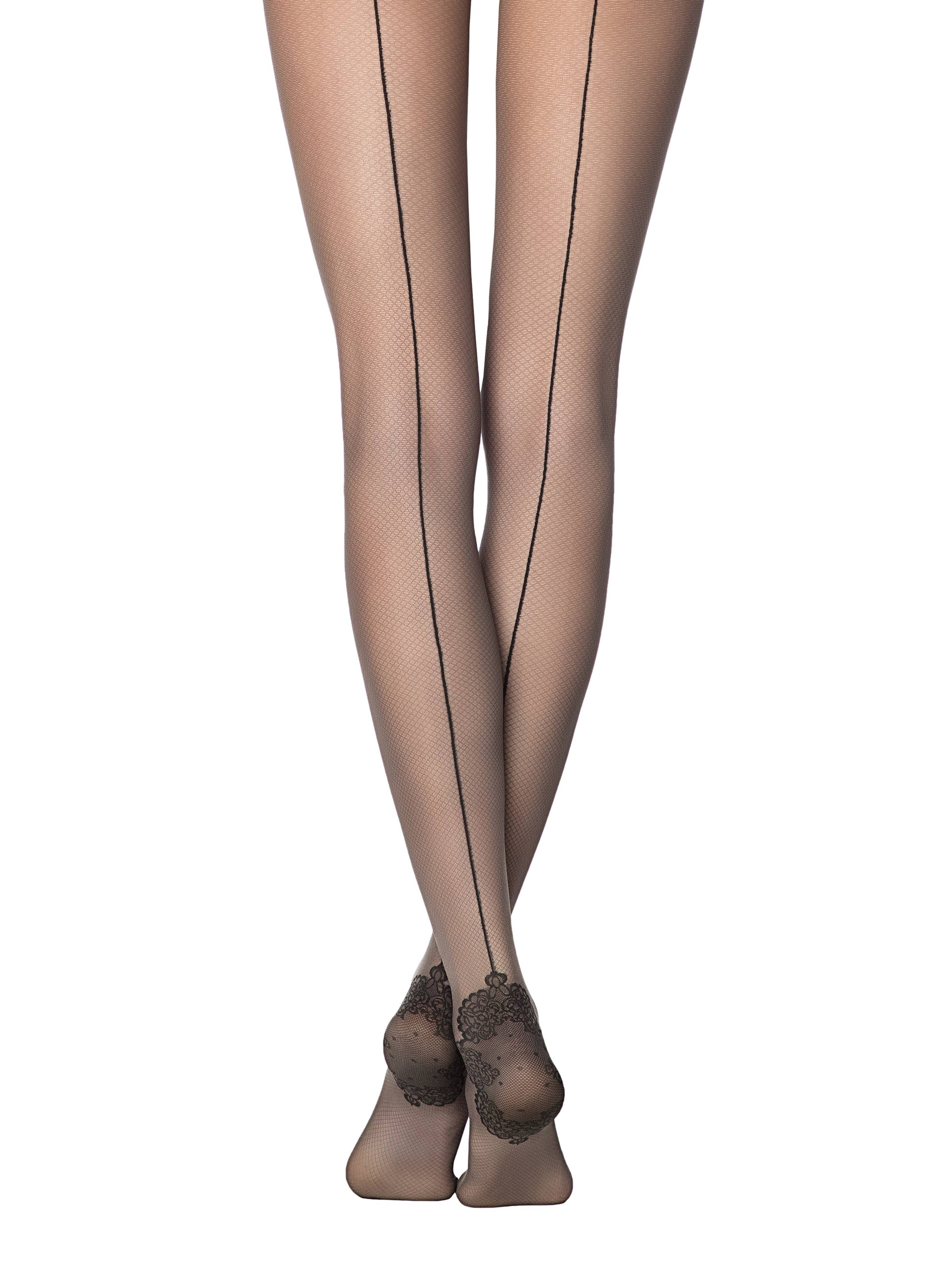 These Conte Trace 20 Den fantasy women's tights feature a delicate, transparent 20 denier fabric that delivers both elegance and durability. The tights are adorned with a subtle pattern of very small rhombuses extending uniformly along the entire length, complemented by an openwork design on the heel and toes for added sophistication. Designed with a classic high waist and a 3 cm elastic band, they ensure a secure, comfortable fit. Additional details include an even seam running along the back of the leg, a cotton gusset for breathability, and reinforced openwork shorts in rhombus patterns that enhance both style and comfort. Ideal for those seeking refined, patterned hosiery with expert craftsmanship.
