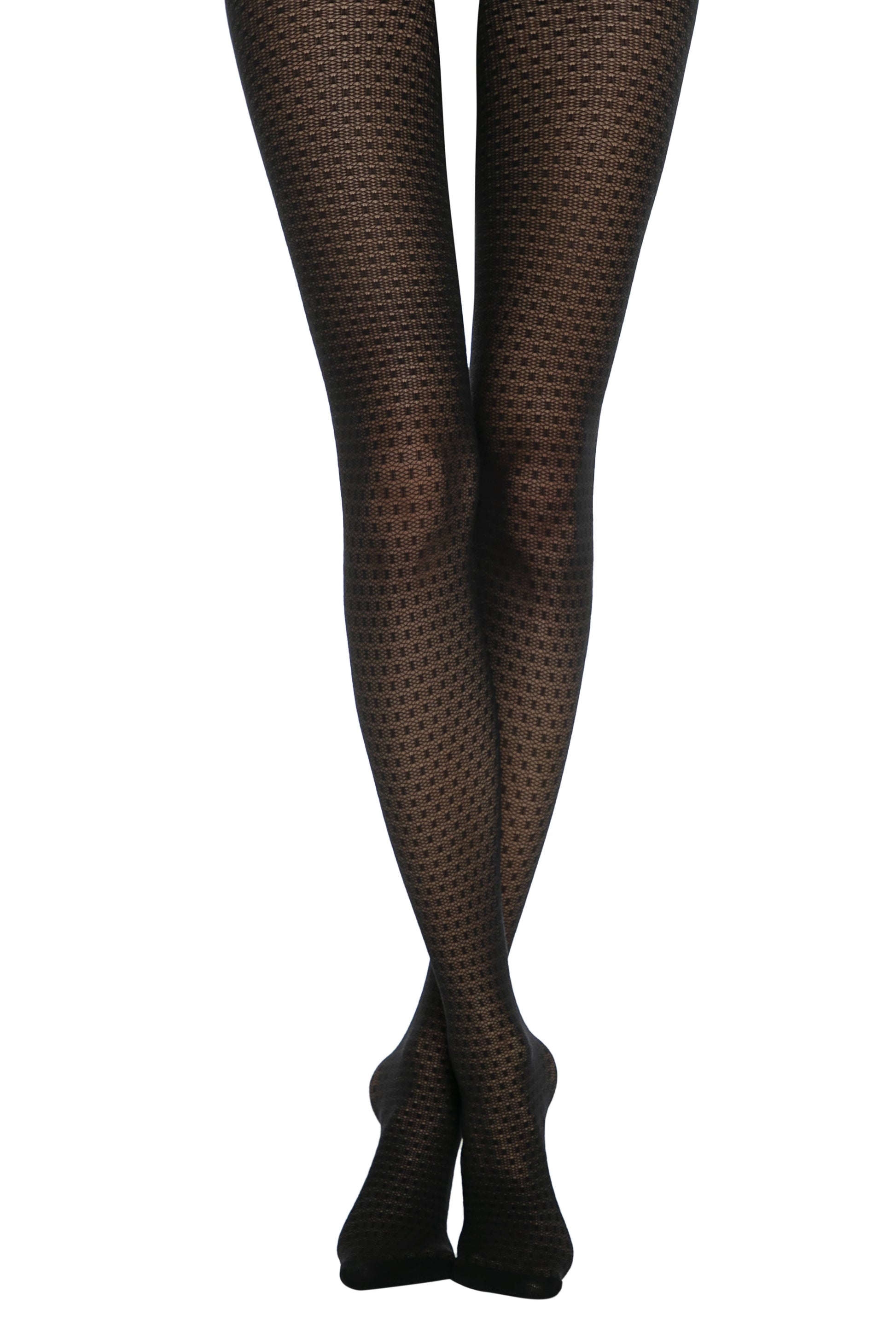 Thick elastic fantasy tights 30 den of medium density with an openwork geometric pattern "dot". Classic fit at the waist. Tights are made of polyamide and elastane, with Lycra, uniform along the entire length, flat seam, cotton gusset, elastic waistband width - 1.5 inches, compacted toe.