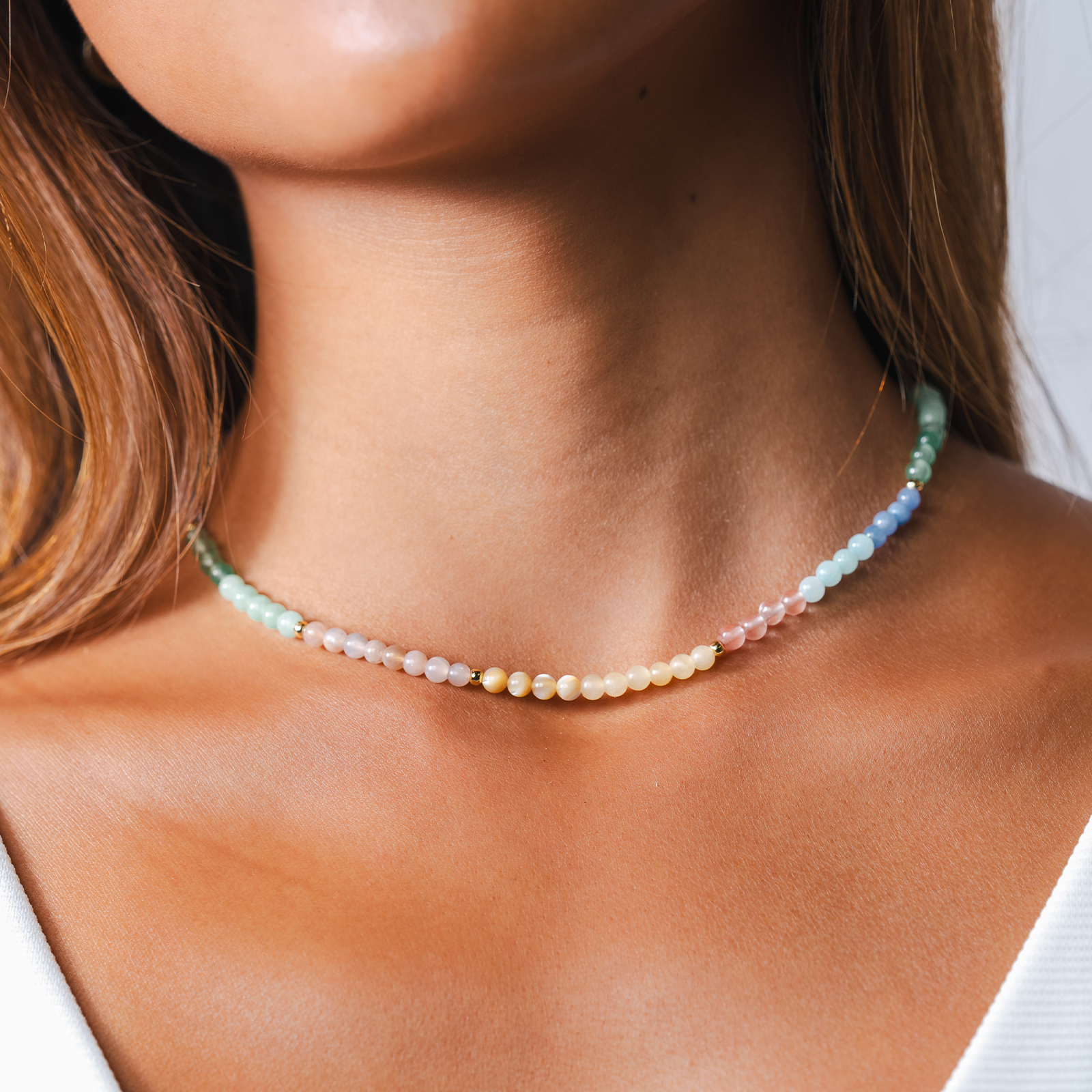 Featured Stones: Amazonite, Aventurine, Cherry Quartz, Mother of Pearl, Sunstone