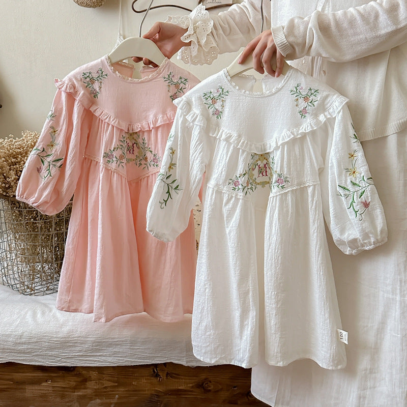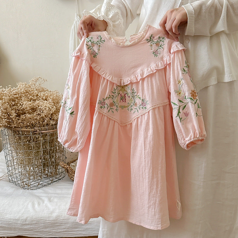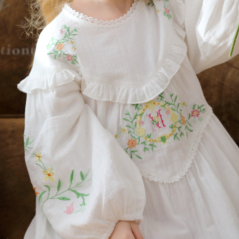 Design Autumn Girls Floral and Vines Pattern Ruffle Neck Long Puff Sleeves Dress