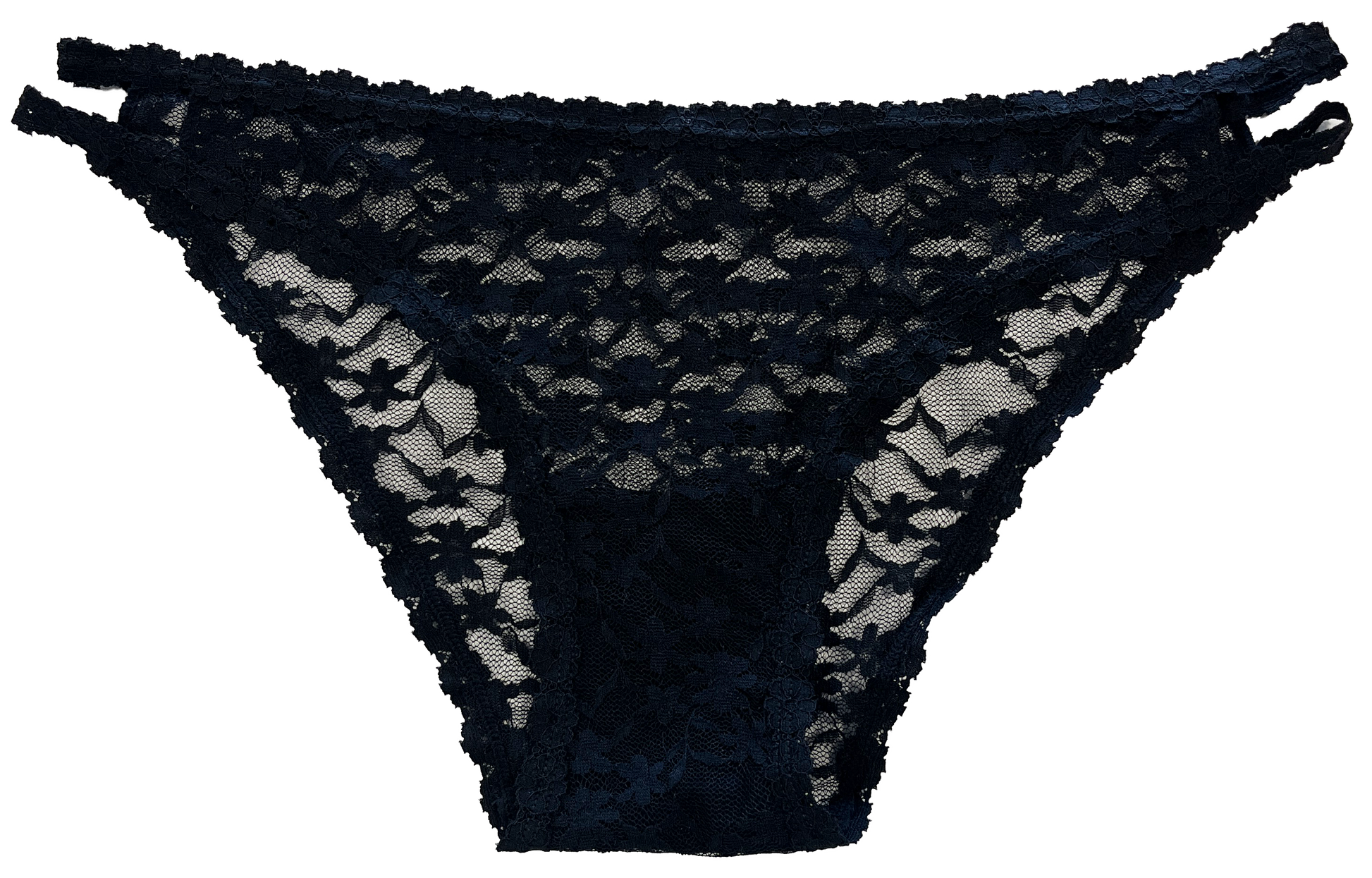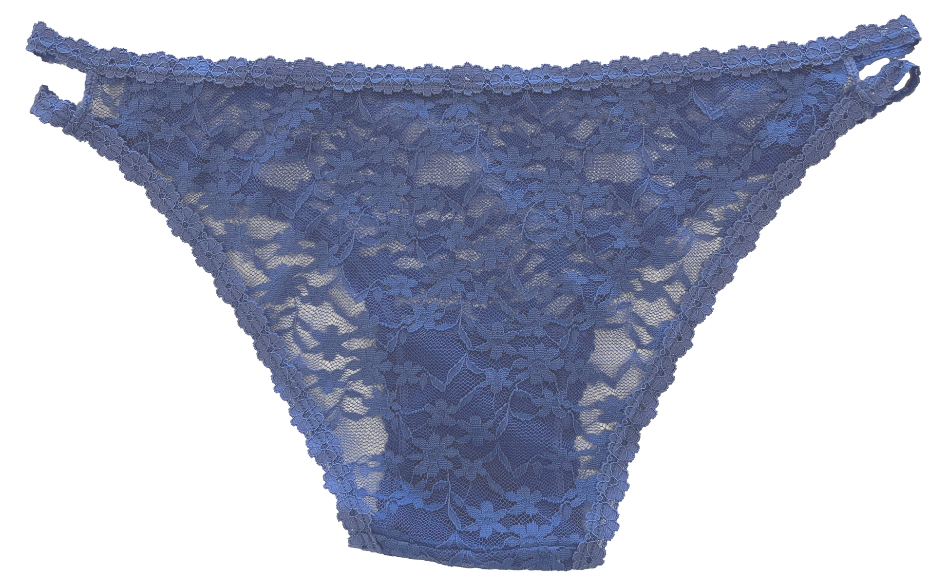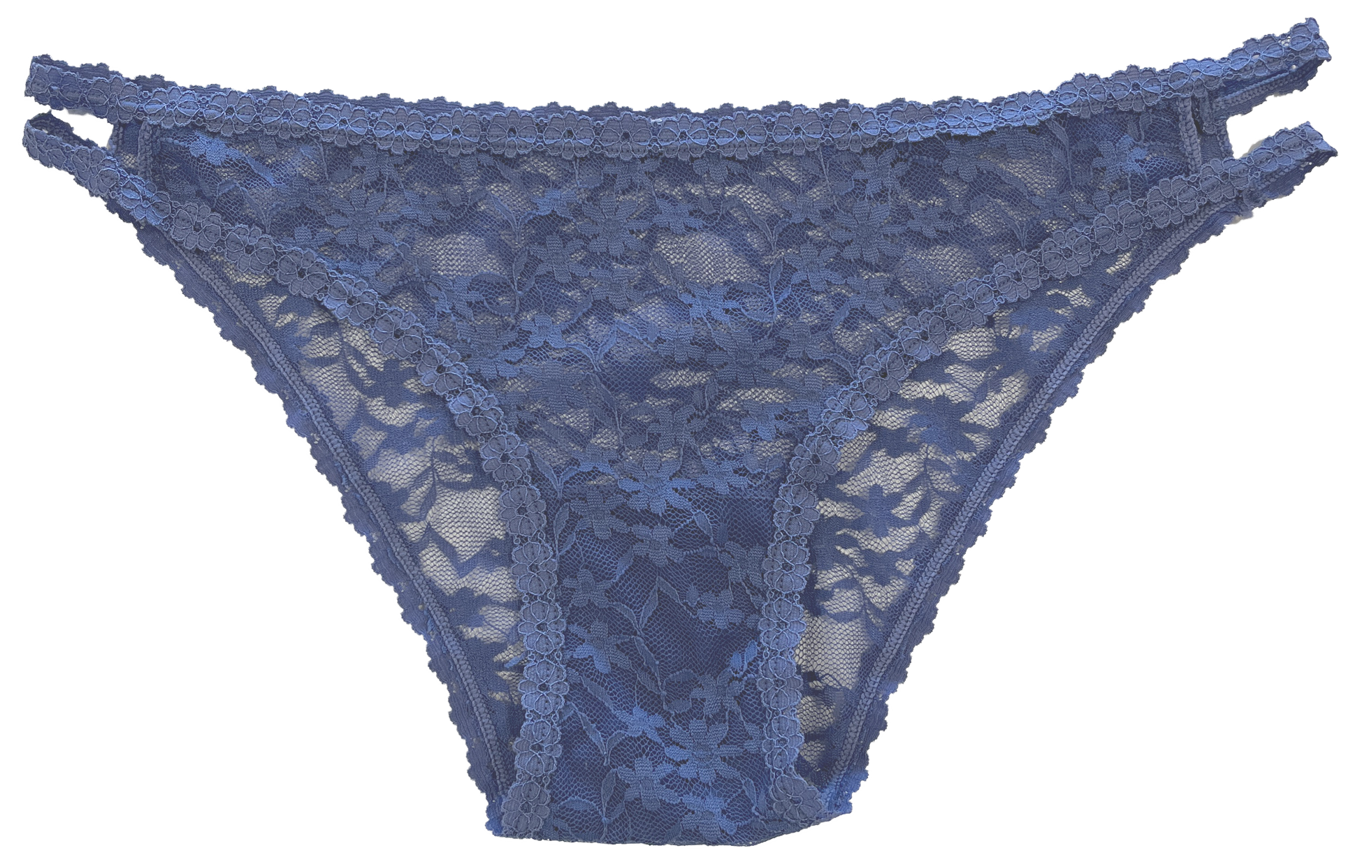Beautiful lace cheeky with double straps at the hip. Cotton gusset. Available in black and velvet morning blue. XS-2X