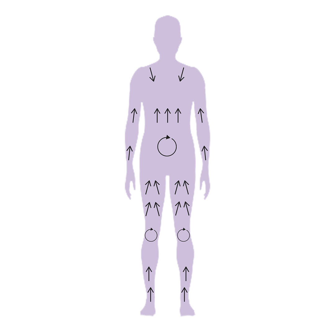 Before showering, start brushing at the feet using upward strokes. Use pressure that is comfortable for you. Work your way up, taking care not to brush over injured skin such as cuts or burns. Brush towards the heart and use gentle pressure in areas of delicate skin. Avoid face.