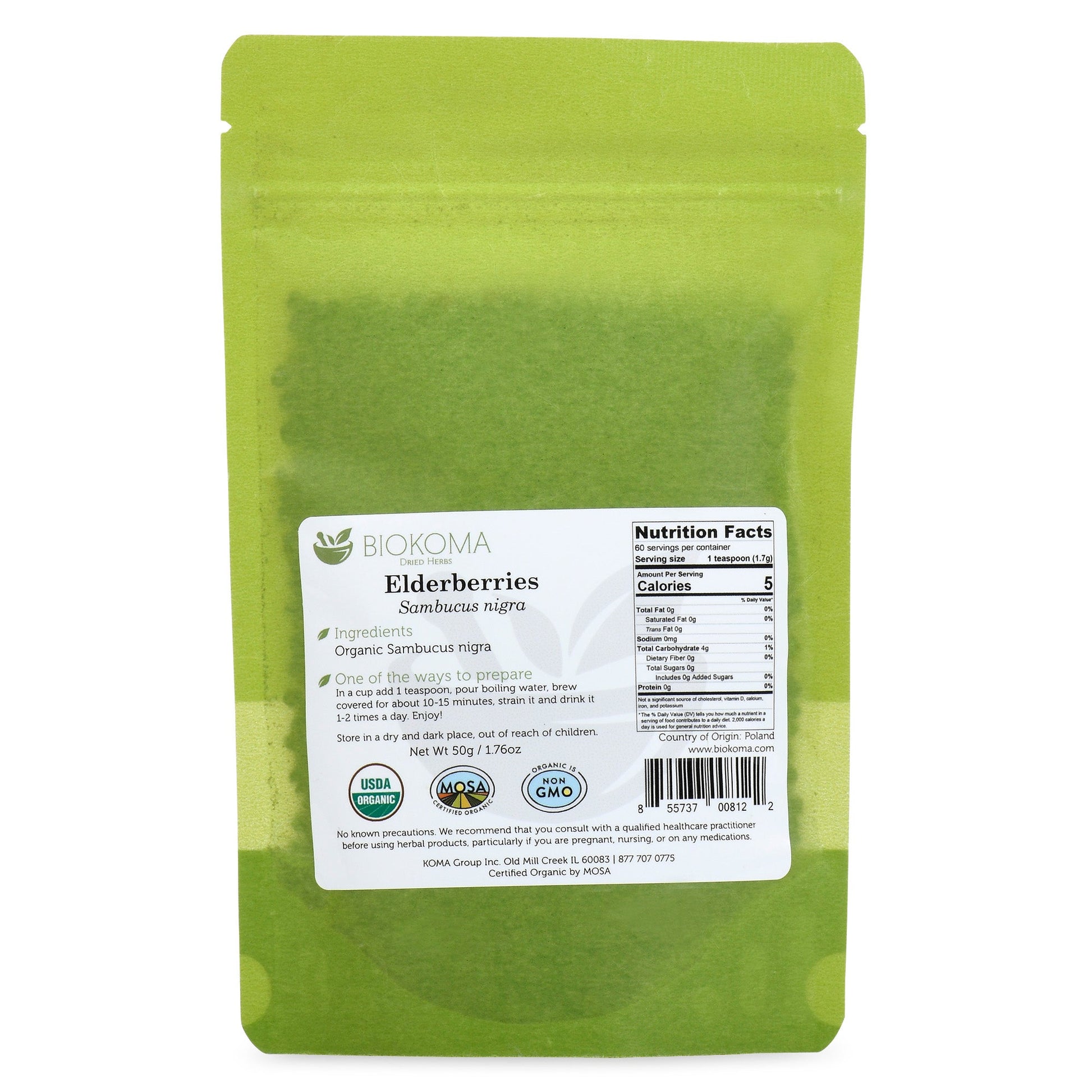 Most important health benefits of Biokoma Elderberries include their ability to boost immune system function and moderate the digestive process. Biokoma Elderberries are also mildly laxative, a diuretic, and diaphoretic. This herb is also a rich source of flavonoids, especially anthocyanins, that are powerful antioxidants and protect cells against damage.