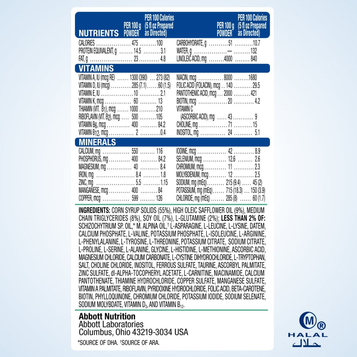 Ingredients: Corn Syrup Solids (55%), High Oleic Safflower Oil (9%), Medium Chain Triglycerides (8%), Soy Oil (7%), L-Glutamine (2%). Less than 2% of: C. Cohnii Oil, M. Alpina Oil, L-Asparagine, L-Leucine, L-Lysine Acetate, DATEM, Calcium Phosphate, L-Valine, Potassium Phosphate, L-Isoleucine, L-Arginine, L-Phenylalanine, L-Tyrosine, L-Threonine, Potassium Citrate, Sodium Citrate, L-Proline, L-Serine, L-Alanine, Glycine, L-Histidine, L-Methionine, Ascorbic Acid, Magnesium Chloride, Calcium Carbonate, L-Cystine Dihydrochloride, L-Tryptophan, Salt, Choline Chloride, Inositol, Ferrous Sulfate, Taurine, Ascorbyl Palmitate, Zinc Sulfate, dl-Alpha-Tocopheryl Acetate, L-Carnitine, Niacinamide, Calcium Pantothenate, Thiamine Hydrochloride, Copper Sulfate, Manganese Sulfate, Vitamin A Palmitate, Riboflavin, Pyridoxine Hydrochloride, Folic Acid, Beta-Carotene, Biotin, Phylloquinone, Chromium Chloride, Potassium Iodide, Sodium Selenate, Sodium Molybdate, Vitamin D3, and Vitamin B12.