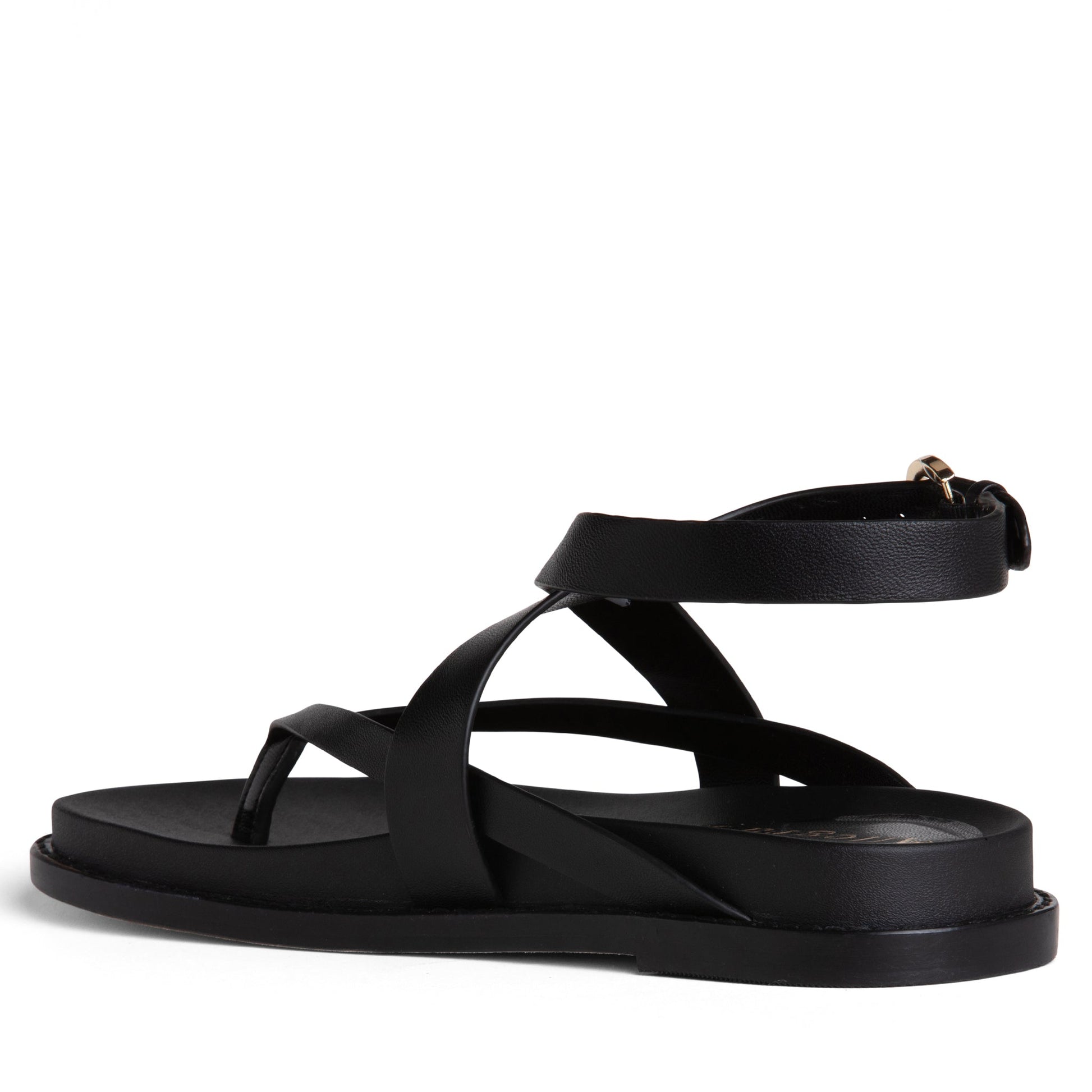 Casual and chic in black leather. The Elise flat sandal features a foot bed, a thong and an adjustable ankle strap.