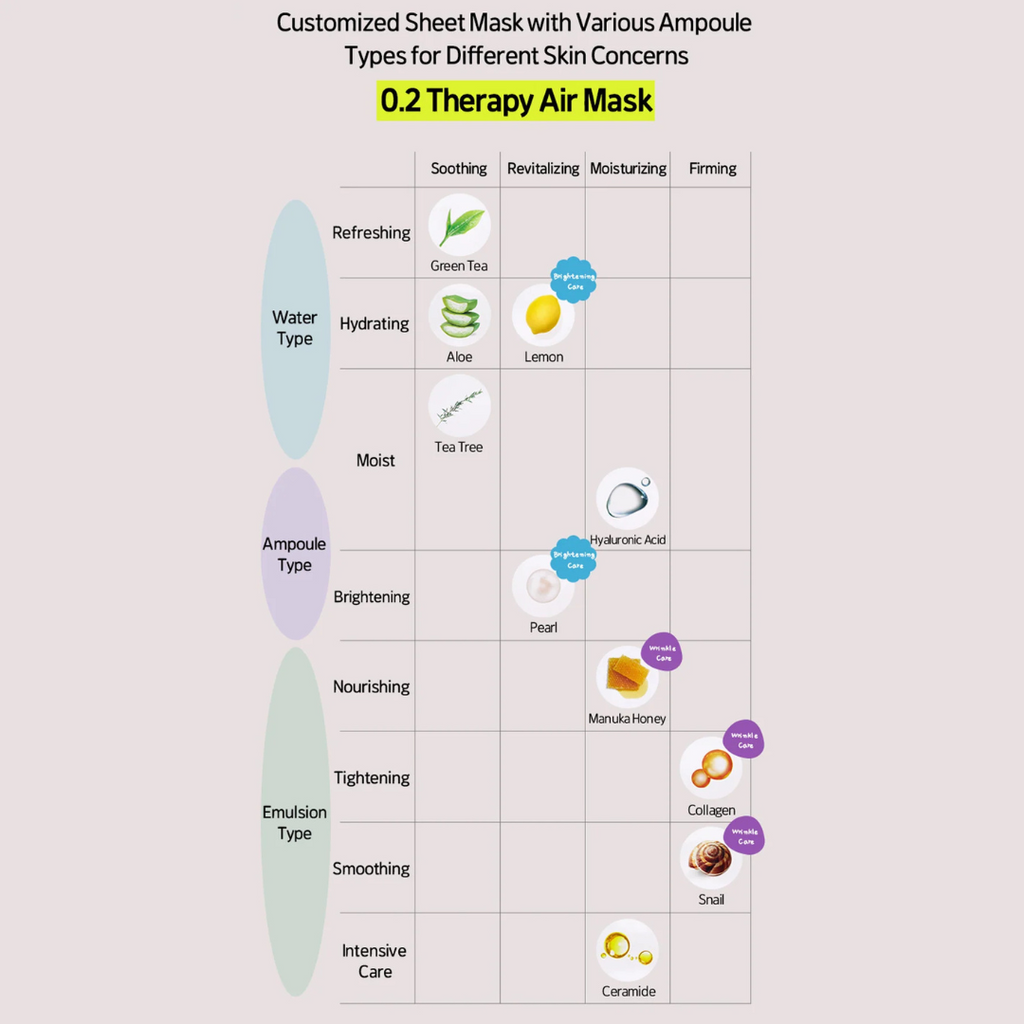 - Watery type is lightweight and fresh; Ampoule type replenishes the skin with intensive moisture; Emulsion type is rich in nutrition which allows soft absorption.