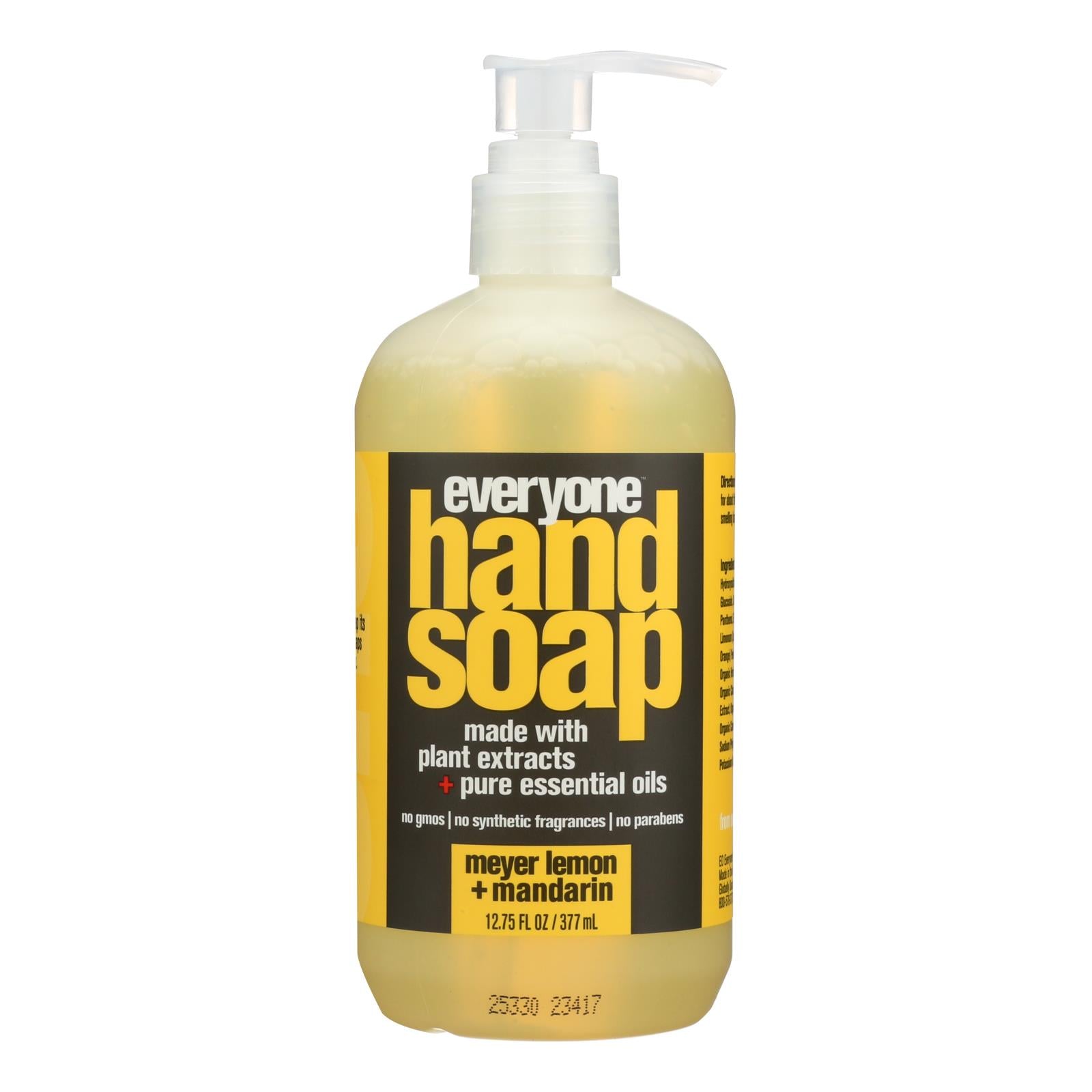 Everyone hand soap, meyer lemon+mandarin is never tested on animals. This product gives you clean hands now and is made with plant extracts and scented with pure essential oils. Everyone hand soap, meyer lemon+mandarin has a refreshing scent and leaves hands feeling clean and happy. This product is certified gluten-free and non-gmo project verified. Everyone hand soap, meyer lemon+mandarin comes packaged for your convenience in a recyclable, plastic bottle for easy disposal and contains 12.75 fl. Oz. Of product. Everyone loves clean hands. country of origin : united states is gluten free : yes is wheat free : yes Say goodbye to dry, cracked hands and hello to a refreshing and revitalizing hand washing experience! Made with plant extracts and scented with pure essential oils, Everyone Hand Soap in Meyer Lemon and Mandarin is a must-have for every household. And you can feel good knowing that it's never tested on animals and is certified gluten-free and non-GMO. The convenient 12.75 fl. oz. bottle is also recyclable, making it easy to keep your hands clean and your conscience clear. Bring joy and freshness to your daily routine with Everyone Hand Soap, and see the difference it makes!