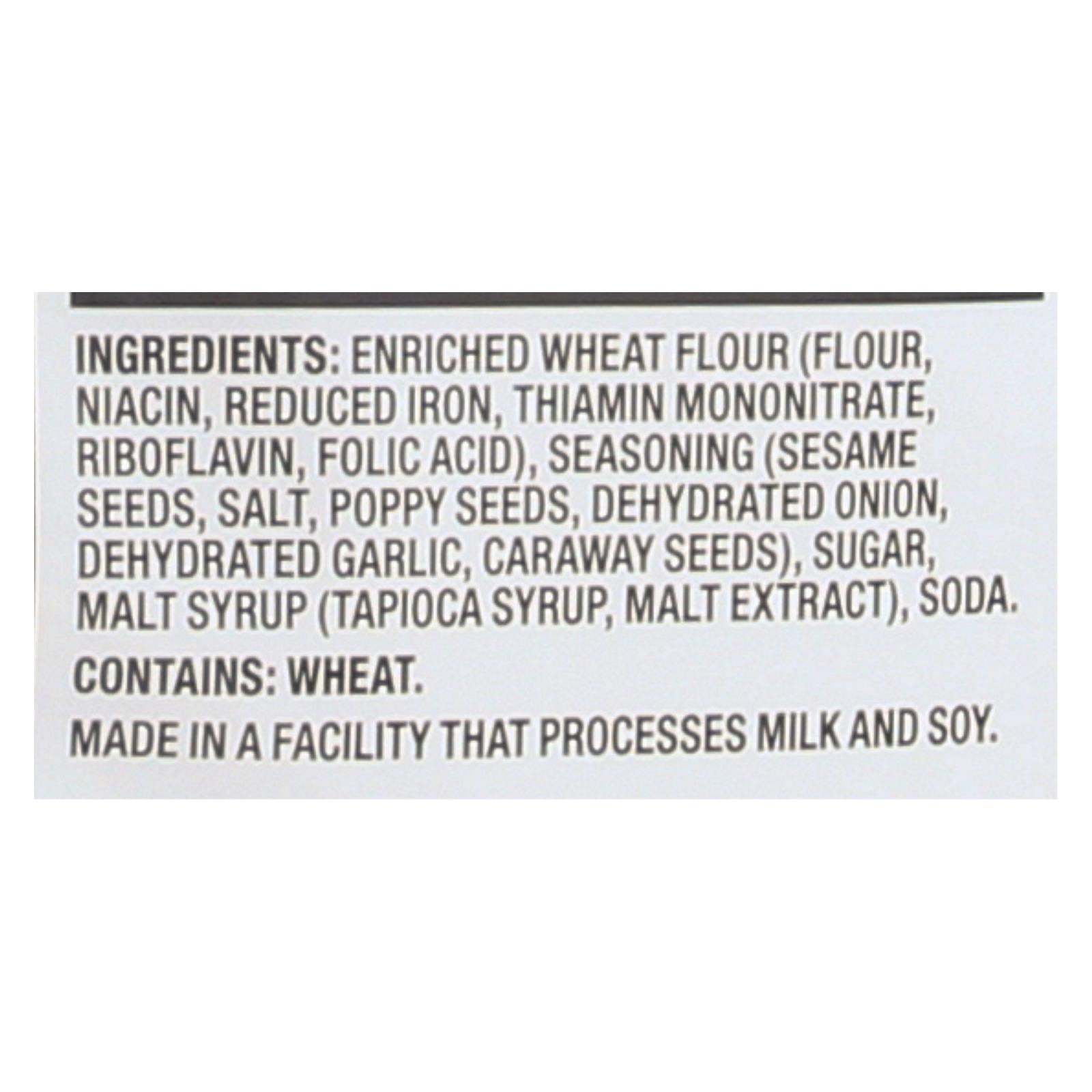 Enjoy a delightful twist on a classic snack with these lighter, crispier, and more wholesome baked pretzel crackers. Each serving of these tasty treats contains only 110 calories and zero saturated fat, making them a smart choice for health-conscious snackers. Certified non-GMO and kosher, they are crafted with enriched wheat flour and a savory seasoning blend that includes sesame seeds, poppy seeds, and a touch of dehydrated onion and garlic.