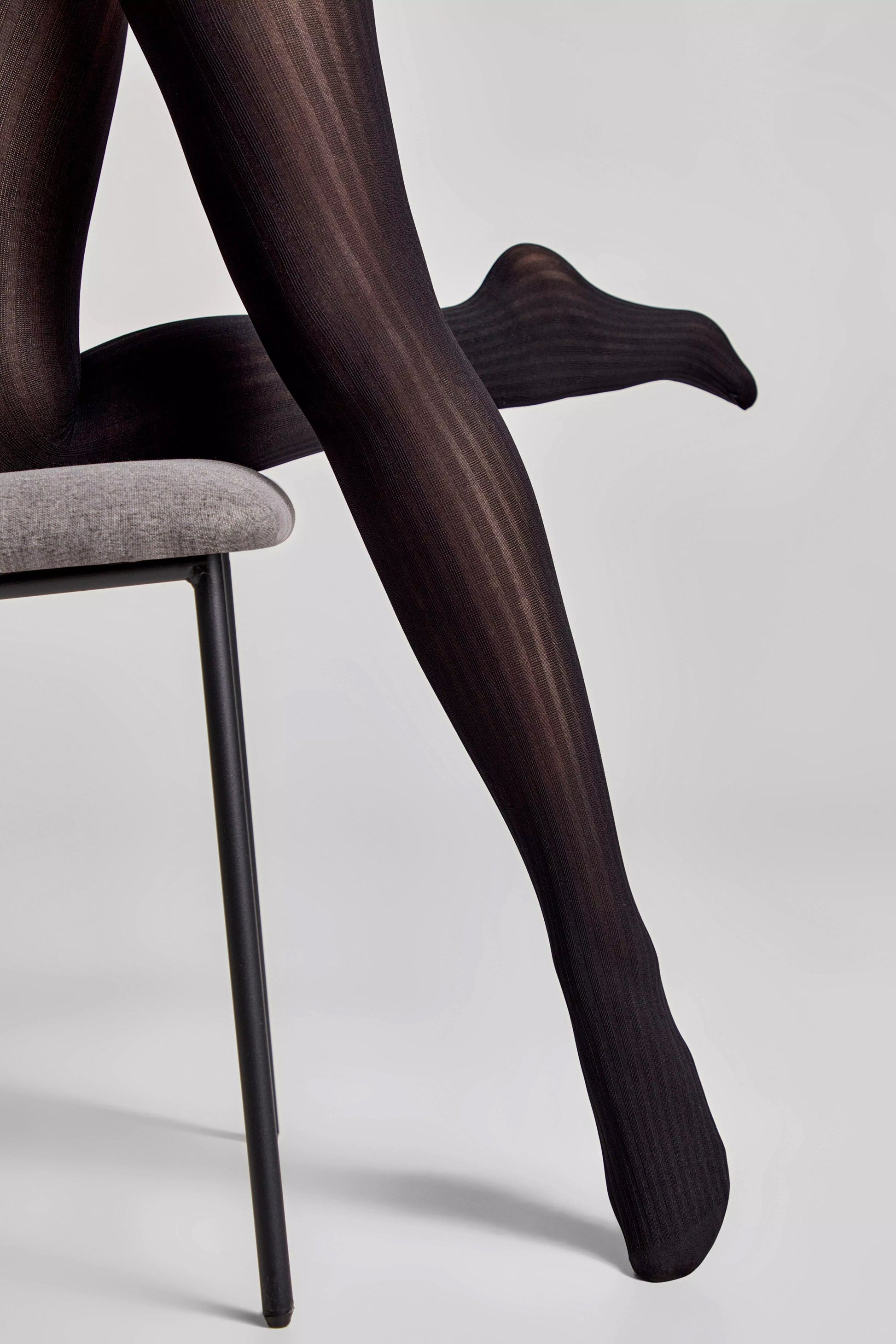 Dense and elastic VOYAGE tights with embossed vertical weaving will add a twist to your casual or evening outfit. You’ll feel comfortable wearing these tights all day long thanks to the cotton diamond-shaped gusset and flat seam.