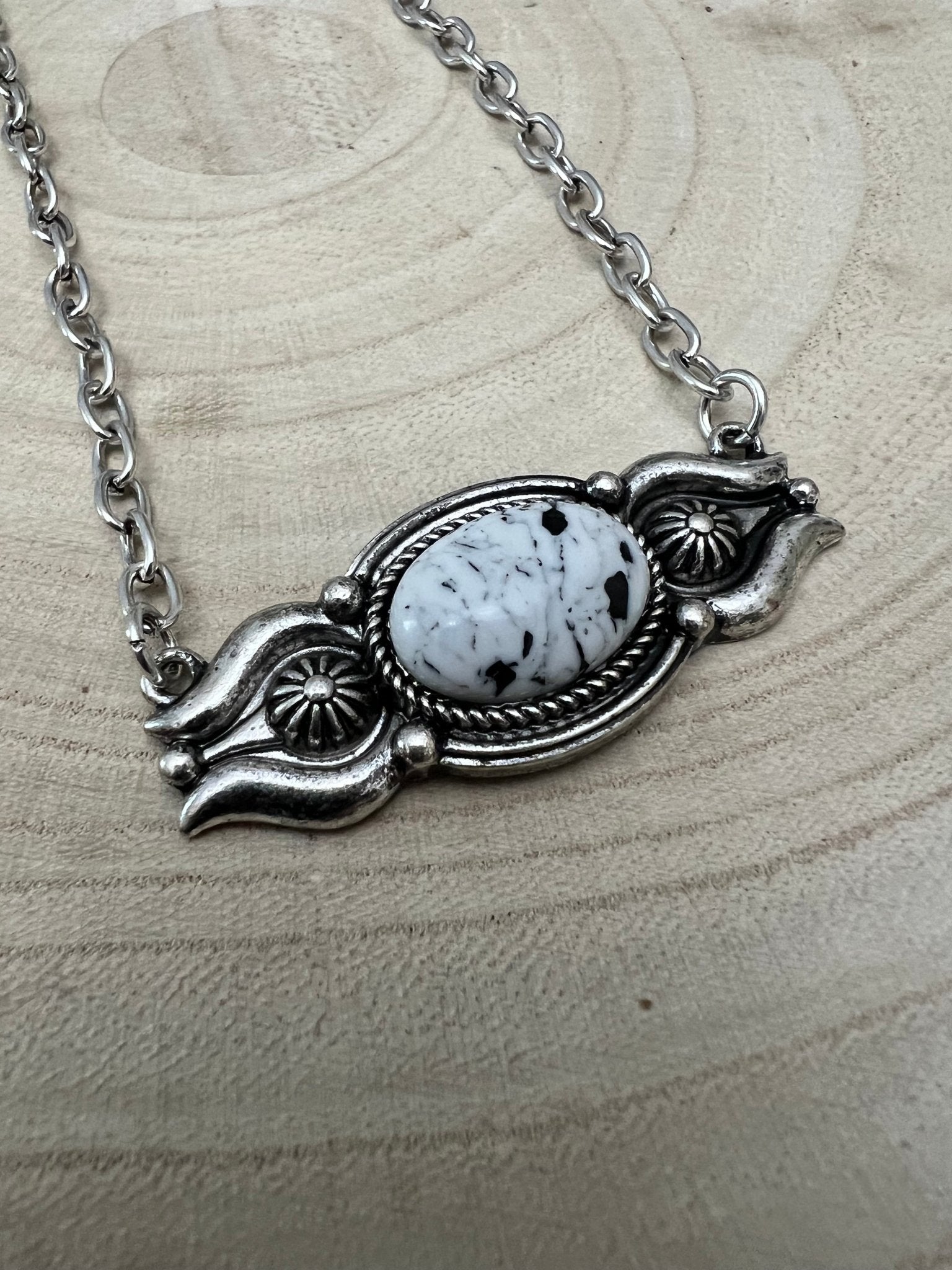 Elevate your Western style with this Faux White Buffalo Bar Necklace, featuring an 18-inch chain with an additional 3-inch extender for a perfect fit. Crafted to mimic the striking look of white buffalo stone, this necklace adds a bold, rustic touch to any outfit.