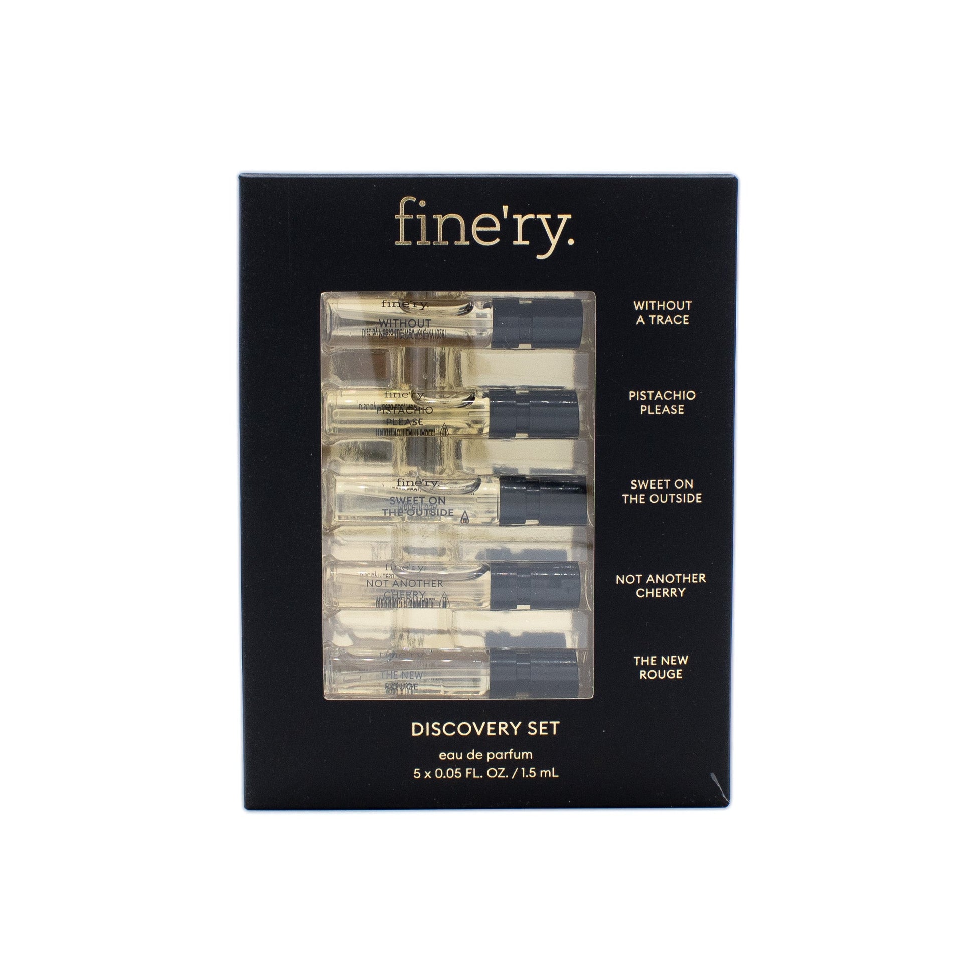 The perfect giftable item that introduces you to the world of Fine'ry. This fragrance discovery set features: Without a Trace, Pistachio Please, Sweet on the Outside, Not Another Cherry, and The New Rouge.