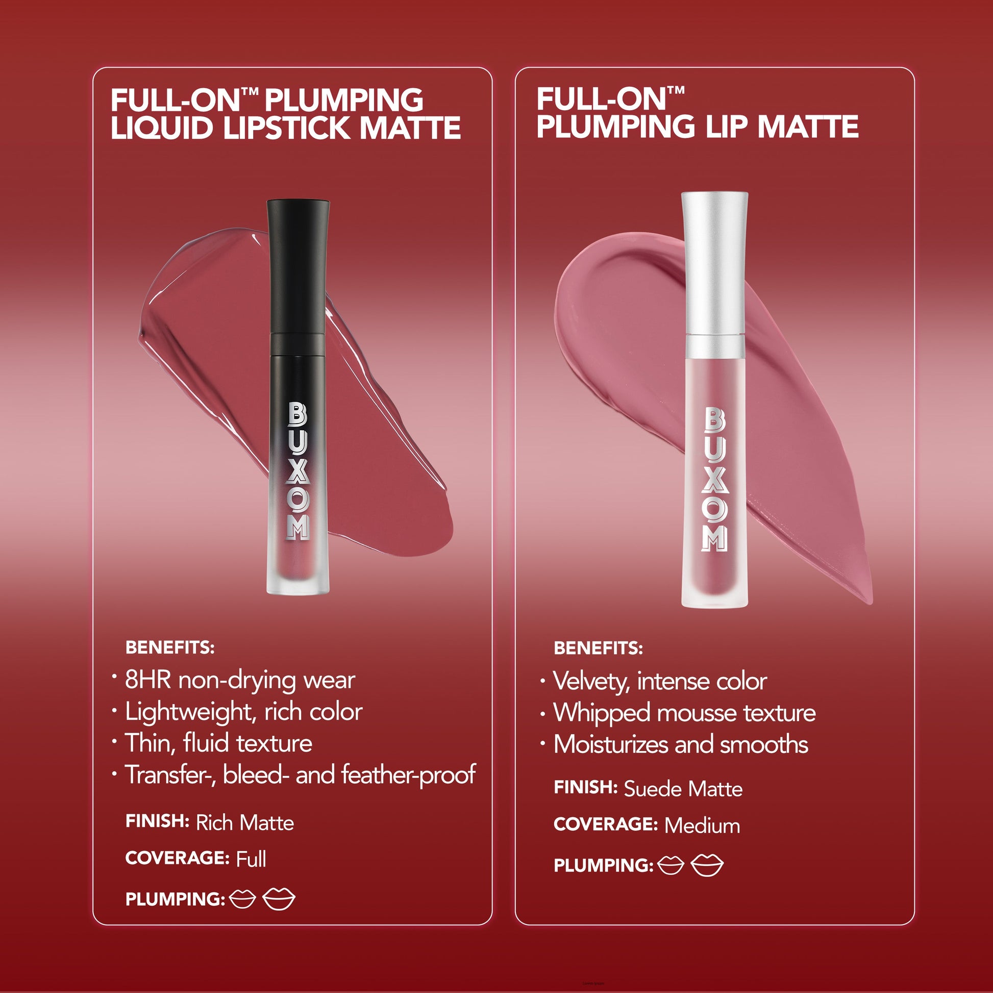 BUXOM’s plumping now in full coverage Full-On Plumping Liquid Lipstick Matte. Transfer-proof pigments stay comfortable and velvety soft for 8 hours. Vitamin E and Natural Seed Oils hydrate and smooth lip lines while Hyaluronic Acid and our iconic Plumping Peptide Complex plump for a cushiony pout.