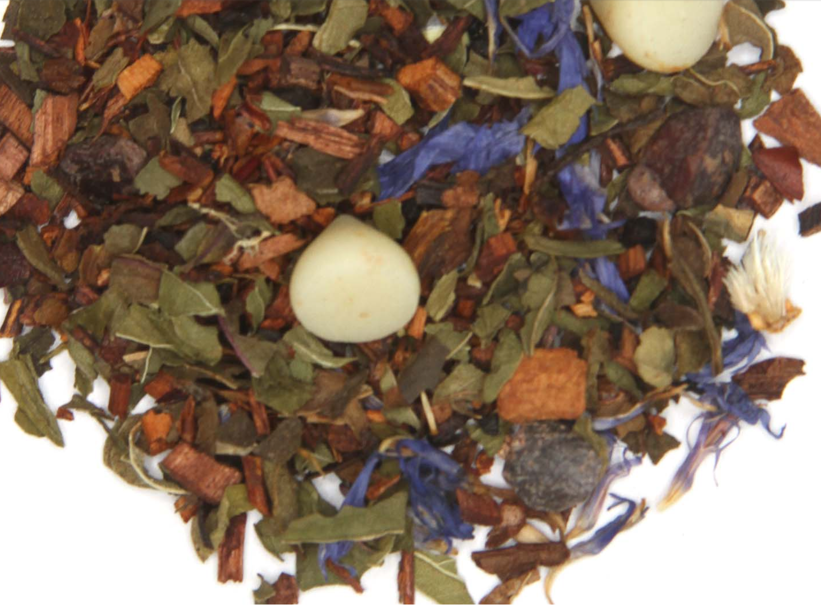 INGREDIENTS: Cocoa Nibs, Rooibos Tea, Honeybush Tea, Peppermint Leaves, Mini White Chocolate Chips (Cocoa Butter, Cane Sugar, Tapioca Starch, Rice Syrup Solids, Rice Maltodextrin, Vanilla, and Salt), Spearmint Leaves, Basil, Chicory, Cinnamon, Licorice, White Chocolate Flavor & Blue Cornflowers
