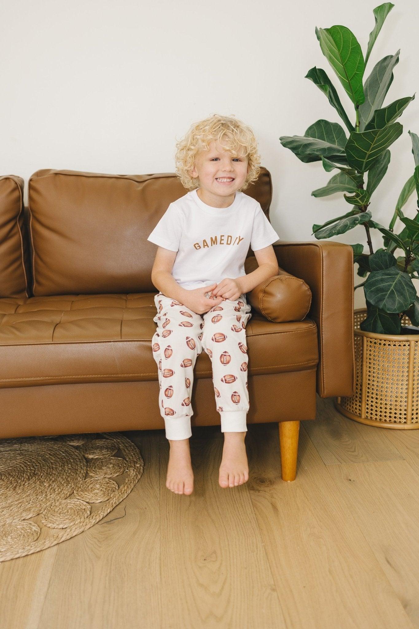 You have the option to choose between a crisp white tee with brown lettering or a stylish brown tee with white lettering to suit your taste. The meticulously screenprinted design guarantees long-lasting wear, allowing your child to proudly support their team throughout the entire season. Whether they're cheering from the sidelines or in the stands, our Gameday Graphic Tee is the ideal choice for young sports fans.