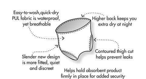 Heavy-duty waist and leg elastics hold leaks in yet are enclosed in the same PUL material to keep you comfortable. A high back design keeps you extradry at night while the contoured thighs prevent leaks from the leg openings.