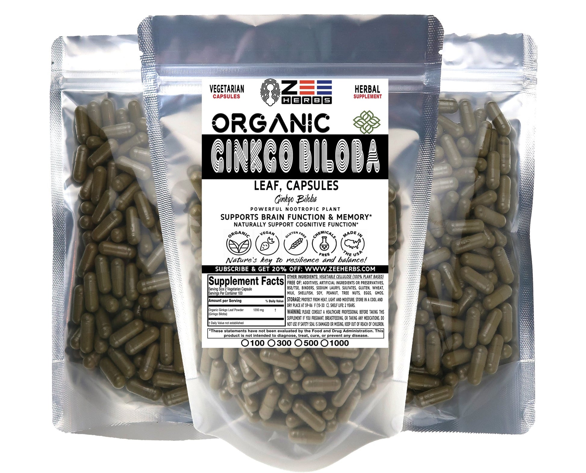 Ginkgo Biloba Leaf Capsules - 1200mg Pure Organic Herbal Supplement