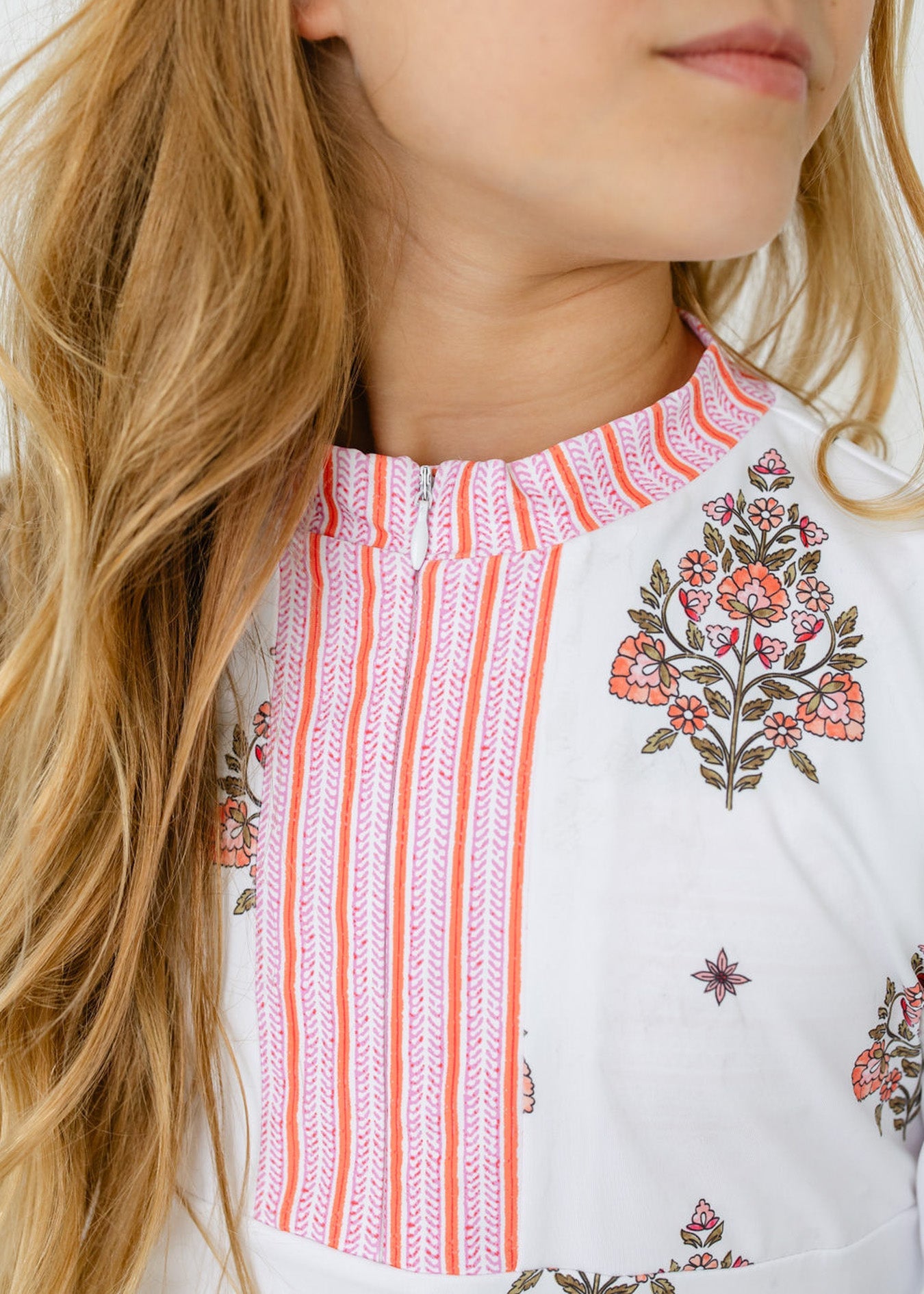 The Girls Amelia Island 3-Piece Long Sleeve Rashguard Set offers sun protection and style with a long-sleeve rashguard and a coordinating two-piece bikini. With a beautiful floral block print, the rashguard features a convenient zipper neck with a contrast striped collar and fun side ruching. The striped bikini top is accented with playful ruffle straps, and the matching boyshort bottoms ensure full coverage. Made from UPF 50+ fabric, this set combines comfort, protection and carefree fun in the sun.