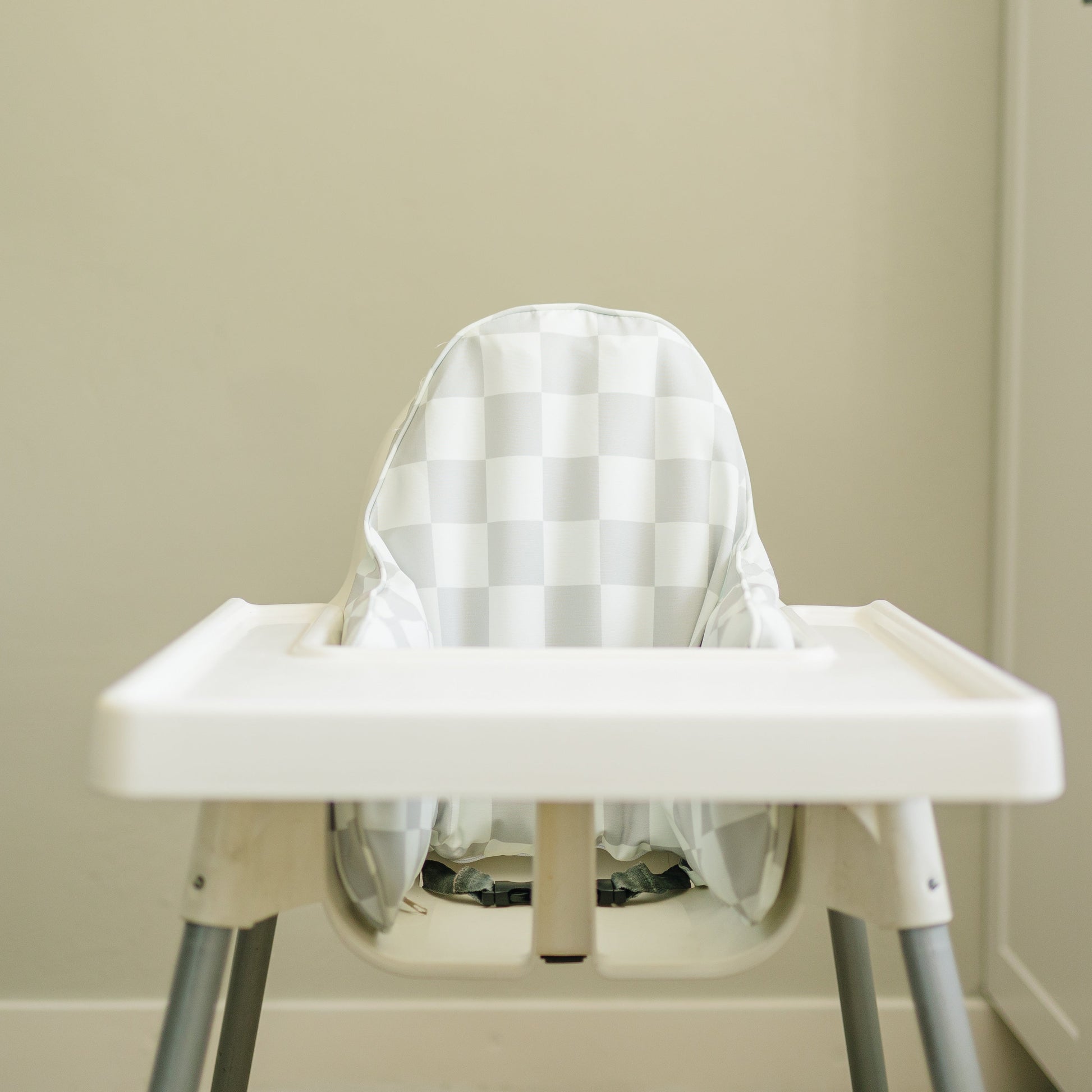 Greige check on a white background! Wipeable cushion cover for the IKEA Antilop Highchair