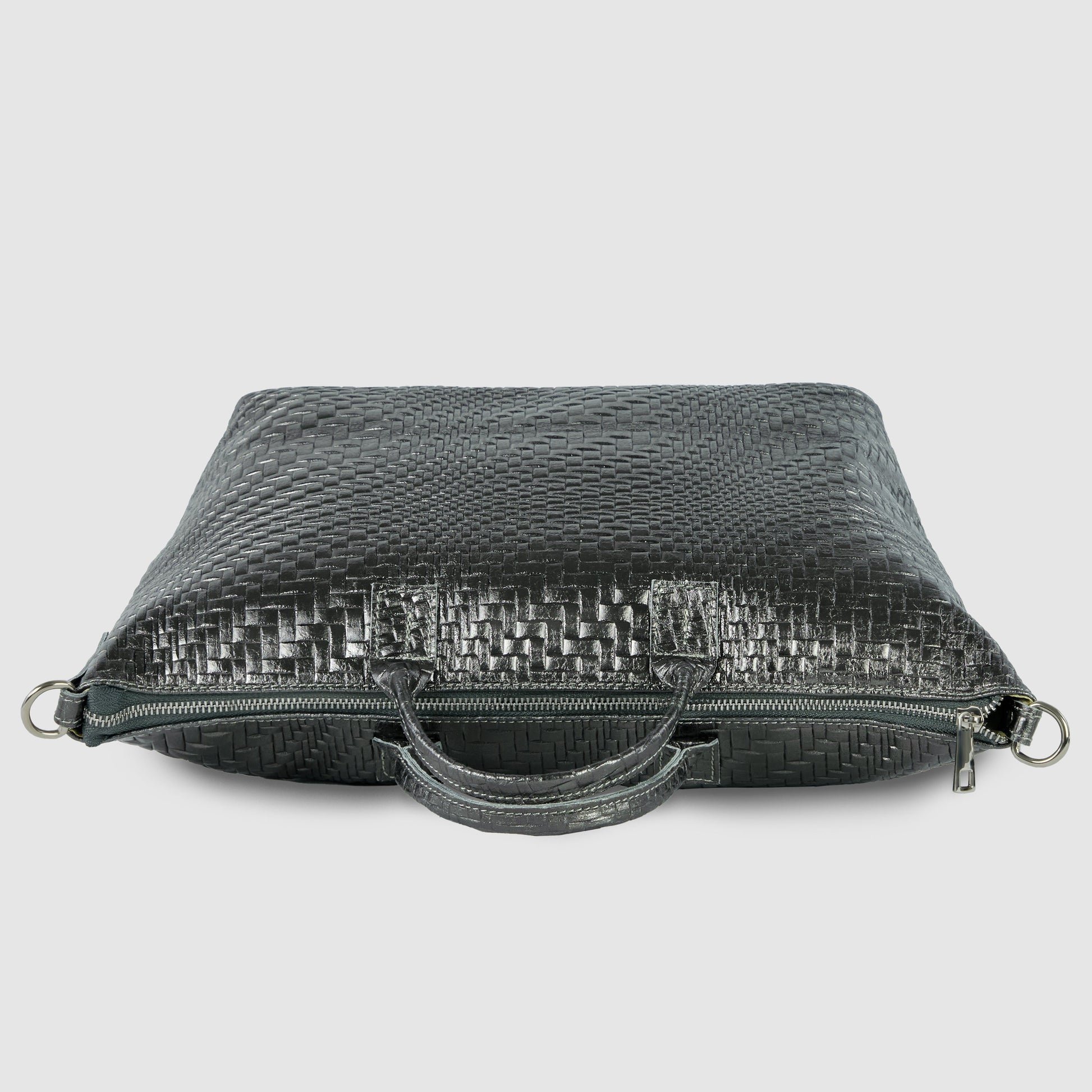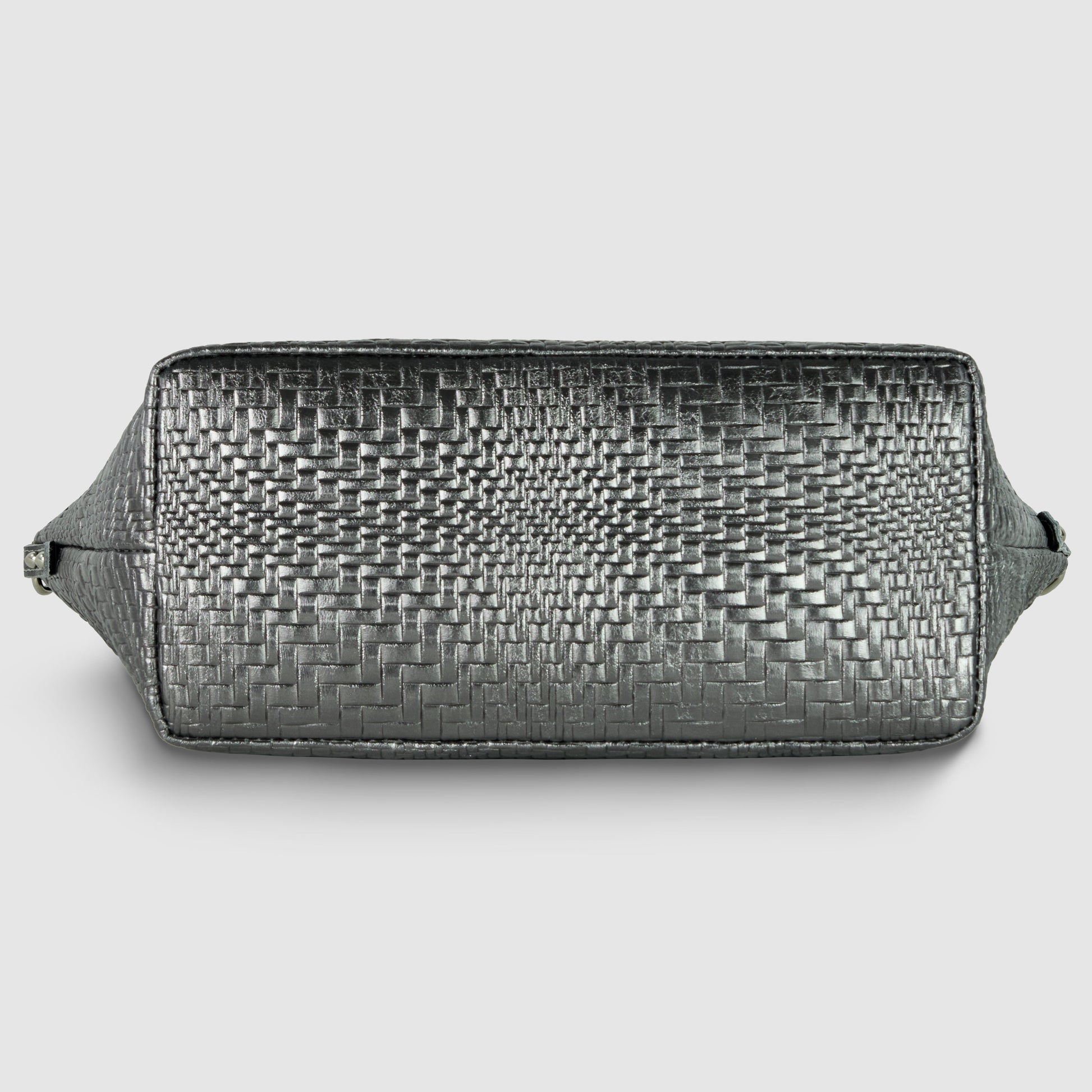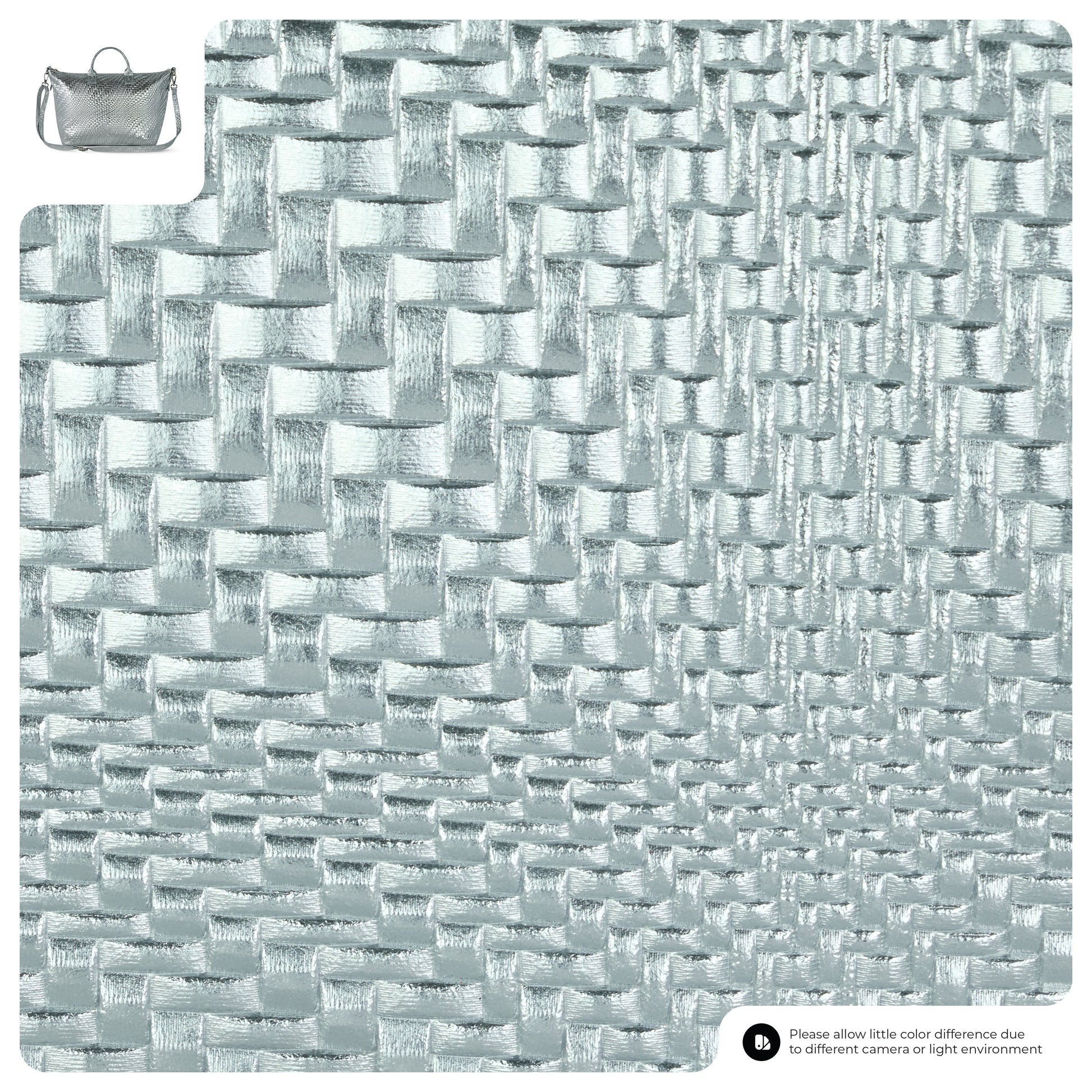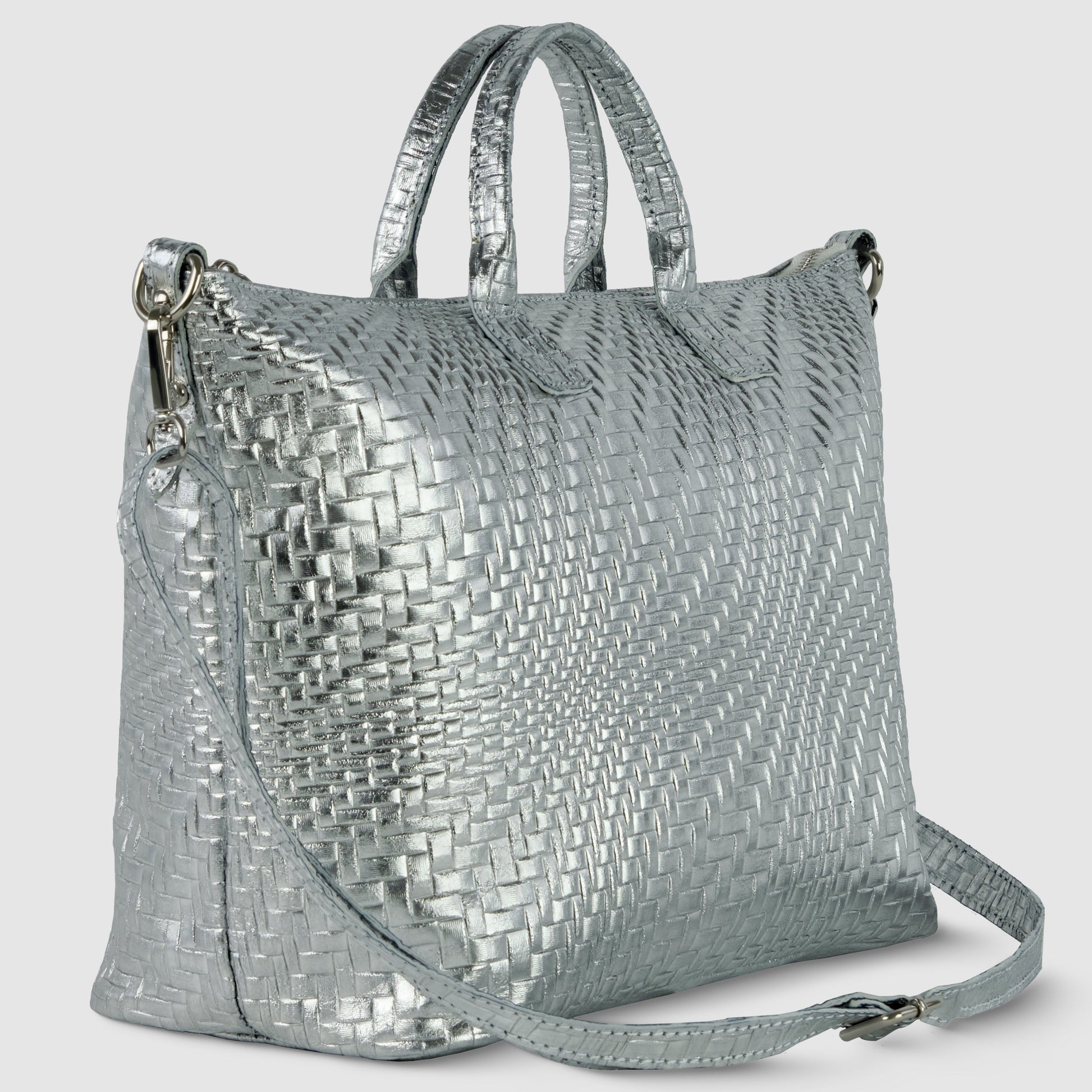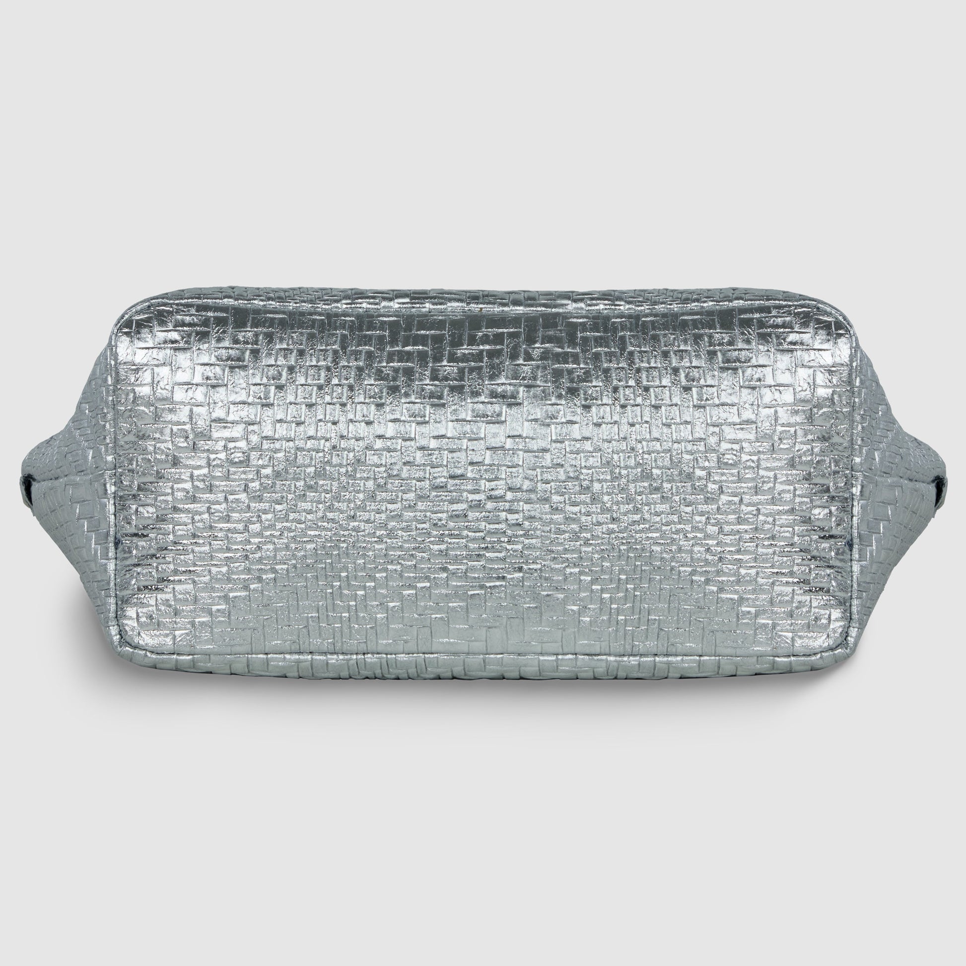 Crafted from Grid Metallic Suede Leather — natural suede with metallic lamination and geometric embossing — the surface reflects light and showcases a woven-like texture. The material bridges Florentine leather tradition with modern design.